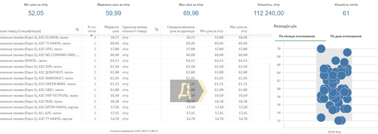 Согласно информации сервиса «Дозорро», в марте бюджетные организации страны (57 тендеров) покупали дизтопливо за куда меньшие деньги: максимальная цена за литр — 69,96 грн, минимальная — 52 грн, медианная 59,99 грн.