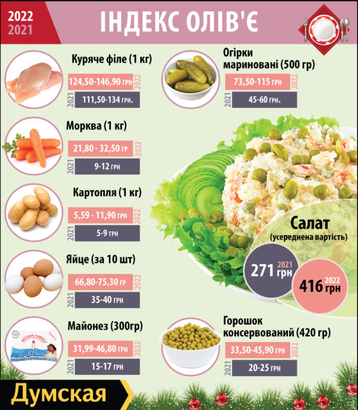 Індекс олів'є: за рік «головний салат» подорожчав в Одесі в півтора раза (інфографіка)Пропонуємо вашій увазі наш огляд цін на продукти, з яких роблять традиційну прикрасу новорічного столу — салат олів'є. На жаль, війна підстьобнула інфляцію, і страва ґрунтовно подорожчала — більше ніж у півтора раза. А на окремі інгредієнти — і в усі два. Ми проаналізували цінники в основних продуктових мережах Одеси, а також на низці міських ринків. У магазинах з'явилися нові товари — скажімо, тепер у них можна купити не тільки звичайне куряче філе (грудку), а й філе зі стегна. А картоплю в супермаркетах тепер пропонують не лише звичайну, миту і преміум, а й другого сорту. Ознаки часу Найсильніше підскочили ціни на яйця — за рік вони подорожчали вдвічі, і тепер коштують у середньому 70 грн. Картопля залишилася на колишньому рівні. В АТБ, наприклад, кілограм другого сорту можна купити навіть за 5,59 грн. Зате подорожчала морква — сьогодні її ціна стартує від 20 грн за кіло. Рік тому морква коштувала 8-12 грн. Курятина то дорожчає, то дешевшає, але зараз якраз період подорожчання — вона коштує на 20-40 грн більше, ніж рік тому. На цінники серйозно вплинули перебої з електроенергією: щоб зберегти продукцію, фермери, скупники й фабрики змушені вмикати генератори і, відповідно, витрачати гроші на паливо. «У випадку з м'ясним виробництвом підприємствам потрібно підтримувати системи вентиляції, а птахівникам — інкубатори. Хоча аграрії впроваджують альтернативне харчування на своїх підприємствах, це коштує їм надто дорого», — пояснює заступник голови Всеукраїнської аграрної ради (ВАР) Денис Марчук. Автор — Надія Маркевич, інфографіка — Ігор Жеведь СМЕРТЬ РОСІЙСЬКИМ ОКУПАНТАМ! Помітили помилку? Виділяйте слова з помилкою та натискайте control-enter |