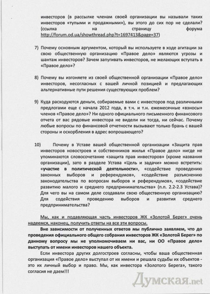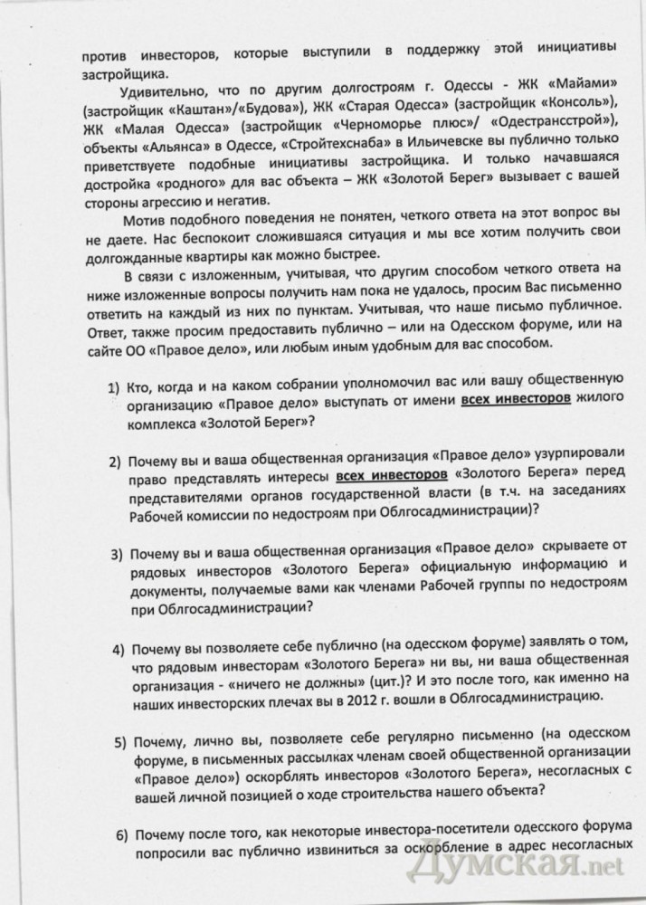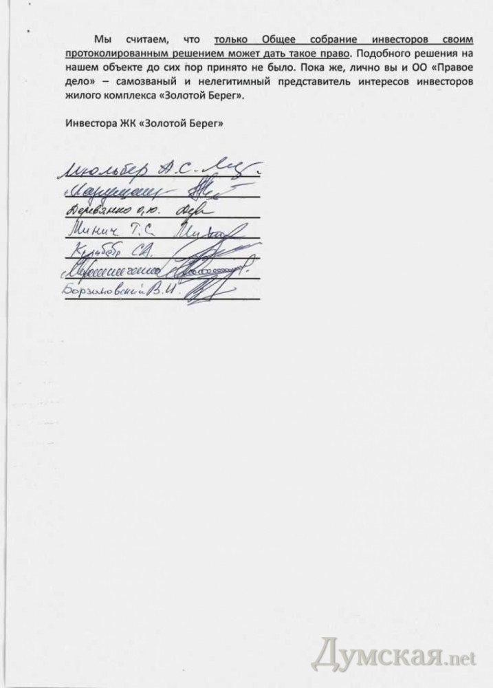 Группа инвесторов жилого комплекса «Золотой Берег» заявляет о саботаже со стороны своих «коллег», которые, по их мнению, мешают проведению работ на объекте. По их словам, организация, выступающая от их имени, вместо содействия скорейшему завершению строительства занимается политикой и непонятными играми с застройщиками, создают им преграды на пути к достройке дома. СМЕРТЬ РОСІЙСЬКИМ ОКУПАНТАМ! Помітили помилку? Виділяйте слова з помилкою та натискайте control-enter