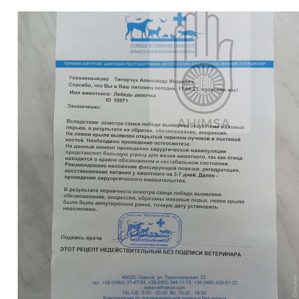 «Через сильне виснаження і зневоднення вона не вийде з наркозу, і ми її втратимо, тому зараз ухвалено найрозумніше рішення — крило їй знерухомили, наклали шину, будемо її відгодовувати і стабілізувати, щоб надалі рятувати крило, — розповіла голова зоозахисної організації «А-Хімса» Олександра Гарбар. — Сумно, але літати вона, найімовірніше, не зможе з двох причин: по-перше, її хлопчик ніколи не зможе літати і вона його не залишить, а по-друге, перелом за весь час ненадання їй допомоги пошкодив м'язи й судини. Крило просто бовтається на шкірі, зовні живлення є, але ніхто не гарантує, що після операції крило знову функціонуватиме».
