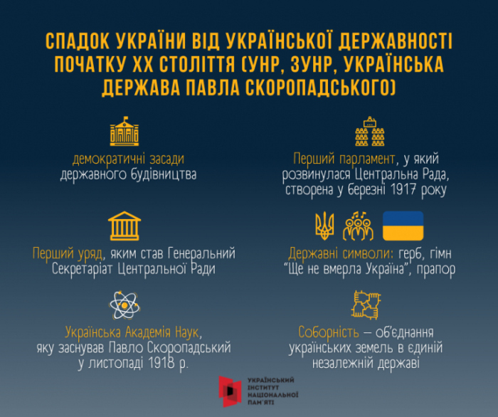 Історія України за 15 хвилин: інститут національної пам'яті підготував мультфільм до Дня ДержавностіМультфільм та тест на знання історії нашої країни підготував до Дня Державності Український інститут національної пам'яті. Анімаційний фільм «Історія України за 15 хвилин» коротко і доступно, але вичерпно розповідає, як наші пращури протягом понад тисячу років створювали на українських землях державні формування, заявляють в Інституті. Історія України – це не 30 років незалежності і навіть не 100 років, якби ми починали відлік від Української Народної Республіки, що виникла у 1917 році. Наші державні традиції вкорінені у Київській Русі, додає заступник голови Українського інституту національної пам'яті Володимир Тилищак. «В умовах інформаційної війни проти України, яку давно розгорнула і продовжує росія, маніпулюючи історичними фактами, розуміння нашої історії у всій її тривалості є надзвичайно важливим», – каже Тилищак. Крім того, Український інститут національної пам'яті підготував тест на знання історії української державності та інфографіку, яка демонструє, що сучасна Україна успадкувала від різних державних формувань минулого. СМЕРТЬ РОСІЙСЬКИМ ОКУПАНТАМ! Помітили помилку? Виділяйте слова з помилкою та натискайте control-enter |