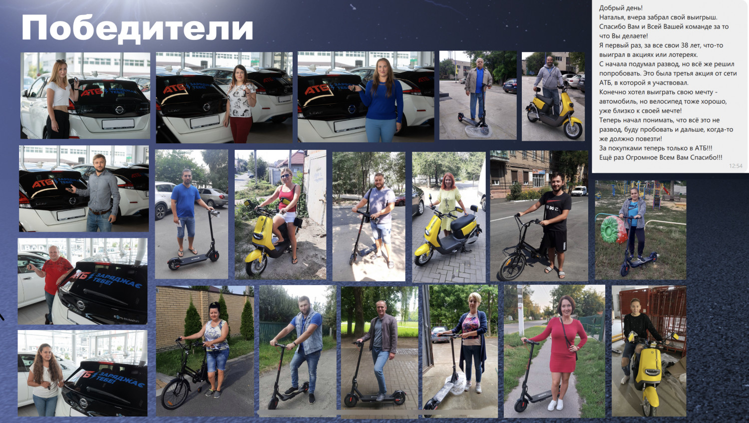 Итоги акции «АТБ заряджає тебе»: пришел за подгузниками для сына, а получил новый Porsche Taycan (новости компаний)Компания «АТБ» подвела итоги самого масштабного и весьма щедрого на призы проекта. Как наверное догадались постоянные клиенты, которых в «АТБ» уже более четырех миллионов, речь идет об энергичной акции «АТБ заряджає тебе». «С первых же дней акция вызвала ажиотаж среди клиентов торговой сети. Лицом проекта стал актер Андрей Данилко в образе Верки Сердючки. Стилизованная под культовую ленту целой эпохи – «Терминатор» – ТВ-реклама привлекла много внимания, став мегахитом. Цитаты из нее разлетелись по соцсетям!» — сообщили в компании. Общее число попыток регистрации кодов достигло почти полумиллиона. Более 360 тысяч из тех, кто выполнил все условия акции, успешно прошли регистрацию и приняли участие в розыгрыше. «Интересно, что число участников составило немногим более 140 тысяч. Это означает, что доверяющие гарантированному качеству продуктов и многолетней безупречной репутации корпорации «АТБ» клиенты участвовали не один раз и даже не два. Впрочем, условия акции это позволяли, — рассказали в компании. — Одним из таких настойчивых и чрезвычайно везучих клиентов крупнейшей по многим параметрам торговой сети страны был Роман из Львова. Ему достался главный приз — премиальный автомобиль культового немецкого бренда Porsche». Как рассказал победитель, в магазин «АТБ» за продуктами он ходит несколько раз в неделю. А с недавнего времени даже чаще, так как 24 августа у него произошло пополнение в семье. «В День независимости моя семья стала больше – у нас родился сынок. Уже второй. Список покупок расширился: добавились подгузники, салфетки и т. д. В нашей семье за продуктами хожу я. В «АТБ» для нас есть все необходимое. Когда увидел по телевидению задорную рекламу «АТБ заряджає тебе» с Сердючкой, даже не раздумывал – сразу решил «заряжаться». Начал регистрировать все чеки. И, как видите, удача мне улыбнулась!» — поделился счастливый обладатель новенького Porsche Taycan. По образованию Роман – инженер радиоэлектроники. Работает во Львове тестировщиком программного обеспечения, строит карьеру в IT-сфере. Как рассказал победитель акции, все необходимое для своей семьи он покупает в супермаркете «АТБ». На прилавках каждого из 1257 магазинов торговой сети представлено более 3,5 тысяч наименований товаров первой необходимости. По словам Романа, в этом богатом ассортименте есть и любимые детские соки для старшего сына, и вкусный шоколад с орешками для его супруги и качественное детское питание для самого маленького члена семьи. По условиям акции совершившим покупку на сумму от 250 гривен (одним чеком) нужно было зарегистрировать указанный в нем код и верить в свою удачу. «Дополнительные шансы можно было получить при оплате картой Visa или Visa АТБ. Напомним, что последняя является совместным продуктом «АТБ» и «Райффайзен банка», дает беспрецедентную мегаскидку на множество товаров в магазинах торговой сети. Причем эта скидка прибавляется к уже действующей, к примеру в рамках акции «Экономия» или «7 дней», — пояснилив компании. Призовой фонд проекта «АТБ заряджає тебе» впечатлил даже самых заядлых скептиков. Среди выигрышей было почти 160 тысяч бонусных сертификатов от Comfy, 500 мобильных батарей, сорок единиц электротранспорта (экологичные скутеры,