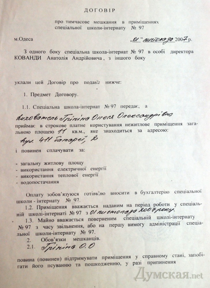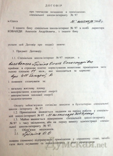 Хочу нагадати про те що Гринина Олеся має квартиру і на данний момент не працює в інтернаті а квартиру в києві здає за 600$ так так можна жити хочу вам сказати про те що коли Олеся закінчила інститут вона просто вимагала про те щоб керівництво інституту дало її направлення саме в цю школу інтеернат №97 я цією інформацією володію тому що під час здійснення перевірки школи нашою комісією ми перевірили всю інформацію Каванда сам написав заяву про звільнення тому що перед його звільненням КРУ здійснювало перевірку і віднайшли багато фінансових порушень на виличезні суми я маю офіційні документи які підтверджують данну інформацію Каванда труїв дітей фекалієм постійно вживав алкоголь на робочому місці він не бідна людина. А виселення всіх хто проживає на території ініціювала комісія яка здійснювала перевірку комісія має всі підстави на полягати на виселенню всіх людей так як довгий час ніхто гроші не платив всі матеріали передані в прокуратуру і вже навіть є визначений час судових слухань Мєлєцкій М.С