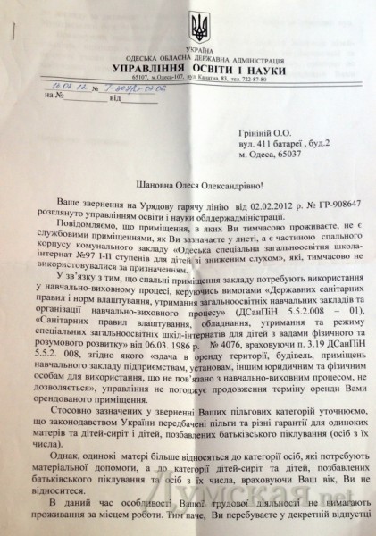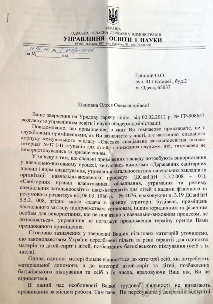 «Сначала мне отвечали, что я вообще здесь не работаю. Только после обращения на правительственную горячую линию, начали признавать тот факт, что я работаю, но состою в декретном отпуске. Сюда я приехала работать после окончания Киевского педуниверситета им. Драгоманова по направлению — работать по специальности. Сейчас же меня хотят фактически выбросить на улицу с младенцем. К тому же, в новых договорах на временное проживание почему-то увеличилась площадь жилья — раньше я платила за 11-метровую комнату, и это было везде прописано. А теперь я живу все в той же 11-метровой комнате, а в договоре — 28 метров.» — рассказывает Олеся Гринина, специалист в области сурдопедагогики.
