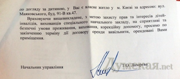 А Договір не вірний.. Допущена помилка.На перший погляд не значна. А в чому справа? Висилити не можуть? У Договорі прочитайте п. 2.1, де Грініна О.О. повинна підтримувати приміщення у справному стани, запобігати його псуванню та пошкодженню, у разі припинення Договору за БУДЬ-ЯКИХ ОБСТАВИН ПОВЕРНУТИ МАЙНО спеціальній школі-інтернату №97 в належному стані, не гіршому, ніж під час передачі його для мешкання.. Договір є, Вона ознайомлена, підпис стоїть.