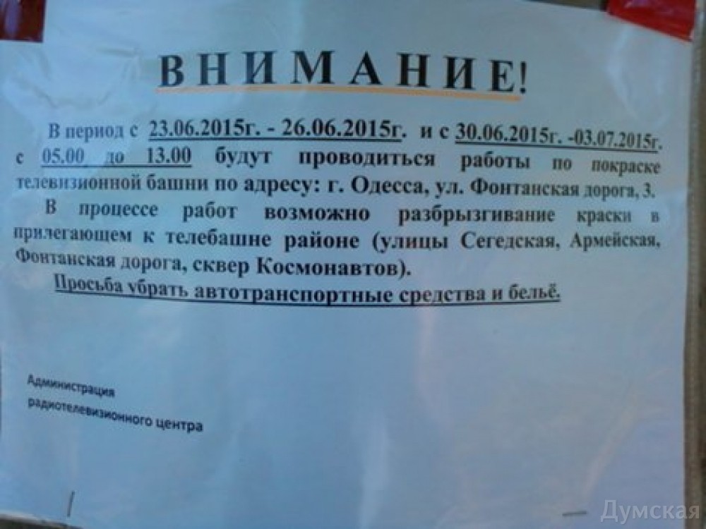 Работы по покраске телевизионной вышки одесского областного радиотелевизионного передающего центра на Фонтанской дороге, 3 вызвали недовольство жителей окрестных кварталов. Как рассказали «Думской» одесситы, башню красили в красно-белый цвет с помощью пульверизаторов. Организаторы работ заранее расклеили объявления, предупредив о том, что это может затронуть автомашины и белье в пределах улиц Гагарина, Армейской и Сегедской, и попросили убрать автотранспорт.