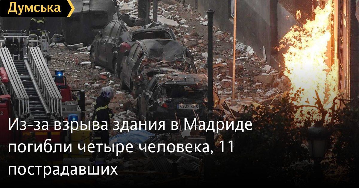 Служба по чрезвычайным ситуациям Мадрида сообщила, что в результате вчерашнего взрыва дома престарелых пострадали не менее 11 человек. Издание El Pais сообщает, что в четверг утром в больнице скончался 36-летний священник, которого достали вчера из-под завалов. Всего жертвами разрушительного взрыва стали четыре человека. Напомним, мощный взрыв произошел вчера днем в семиэтажном здании на улице Толедо. В здании находился дом престарелых, взрыв мог произойти из-за утечки газа.