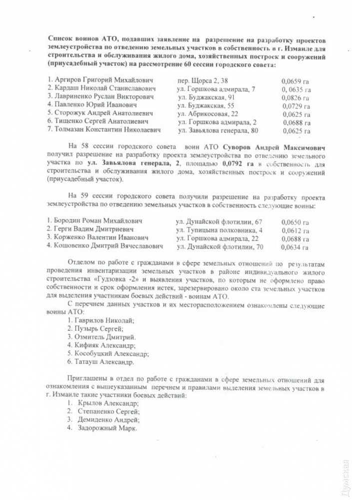 Измаильский горсовет при поддержке депутатов от БППС выделил земельные участки воинам АТО (политика)При поддержке депутатов от партии «Солидарность» Блок Петра Порошенко Измаильский городской совет принял решение о выделении земельных участков для воинов АТО. Решение было принято на 58-ой и 59-ой сессии горсовета при поддержке депутатов от БПП и мэра города, члена партии Андрея Абрамченко. В итоге разрешение на разработку проекта землеустройства по отводу земельного участка получили: Андрей Суворов, Роман Бородин, Вадим Гергиев, Валентин Корженко, Дмитрий Кошовенко. По результатам проведения инвентаризации земельных участков в районе индивидуального жилищного строительства «Гудзовка — 2» зарезервировано еще около 100 земельных участков для выделения участникам боевых действий на востоке страны. СМЕРТЬ РОСІЙСЬКИМ ОКУПАНТАМ! Помітили помилку? Виділяйте слова з помилкою та натискайте control-enter |
