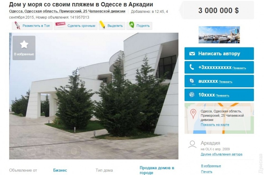 На сайтах объявлений появилась информация о продаже в Одессе «дома у моря со своим пляжем», который расположен на 8-й станции Большого Фонтана. Владелец хочет за особняк («состояние — под отделочные работы, три уровня, закрытая охраняемая территория площадью 20 соток») 3 миллиона долларов США.