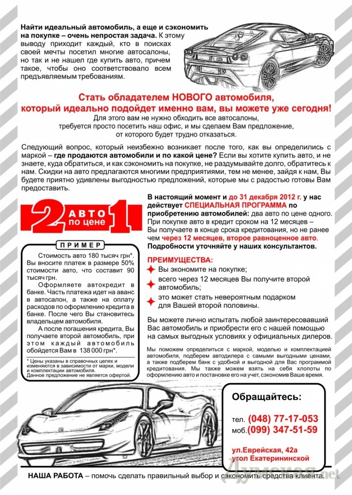 читаем предожение, авто вы не покупаете а берете в кредит. реклама (публичная оферта проше заметить! ) за 1 авто = 180т, т.е. столько же за 2, т.е. 180/2=90, НО вы платите за 1 авто 138т. грн, т.е. +50% год. а эти бесплатные 50% конечно, проценты кредит 50% годовых. нема пытаннь. за 2 авто действительно 180 как за одно. а разницу — в банк, за проценты. ну не за авто же..