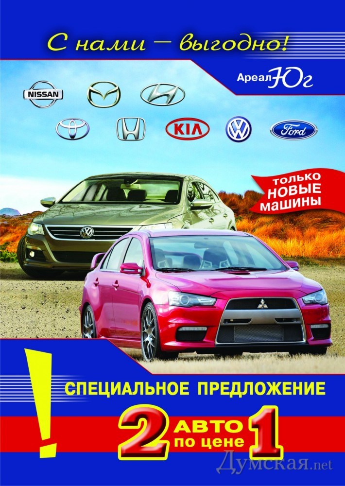 Необычную акцию объявила фирма «Ареал – Юг». Одесситам предлагают в период до 31 декабря 2012 года оформить кредит на любой новый автомобиль и получить второй автомобиль такой же стоимости через 12 месяцев, когда кредит будет выплачен.