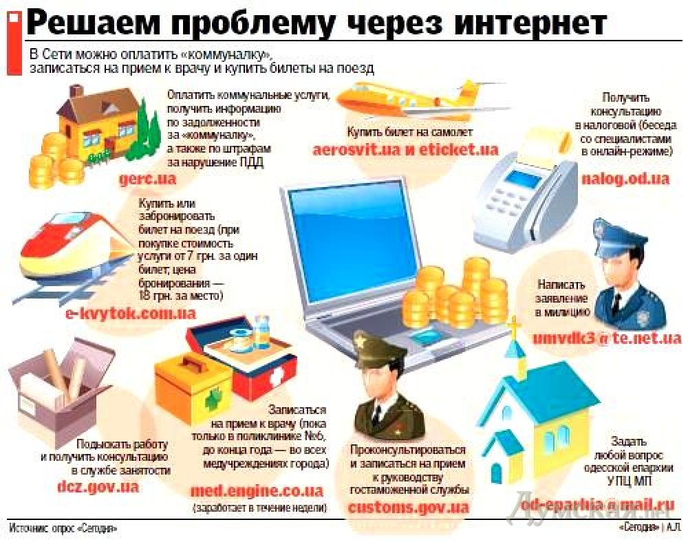 Как через Интернет исповедаться, заказать билет, купить продукты и оплатить «коммуналку»Все чаще властные структуры, чтобы шагать в ногу со временем и быть поближе к народу, осваивают виртуальное пространство. Да и количество услуг, которые можно заказать через Интернет, постоянно увеличивается. Так, во всемирной паутине можно купить продукты, лекарства, оплатить коммунальные услуги, получить консультации налоговиков и даже задать вопрос митрополиту Агафангелу. Еще в 2010-м областные власти утвердили программу информатизации Одесского региона на 2010—2013 года. Согласно документу, в Сети появится интерактивная карта маршрутов междугородного транспорта, будет внедрен электронный документооборот, который позволит сэкономить около 60% средств, используемых на бумагу, а также создана мобильная сеть контроля за выбросами в окружающую среду. А одной из первых и успешно работающих интернет-услуг, как сообщили нам в горуправлении информации, является оплата «коммуналки», штрафов ГАИ и плата в бюджет (налоги, плата за застройку, плата за различные разрешения и справки). «ОРГАНЫ» В СЕТИ. Популярными становятся и онлайн-консультации с чиновниками. Буквально на днях одесские налоговики начали отвечать на вопросы горожан в чате — режиме реального времени, а таможенники еще и предлагают отсылать на адрес dovira@customs.gov.ua жалобы на работников ведомства. Даже заявление в милицию теперь можно отправить через Сеть! «В неделю приходят 2—3 электронных заявления. Тематика как бытовая, так и криминальная», — поведал нам старший инспектор облУВД Владимир Шаблиенко. А еще, напомним, в 2009-м в Одессе, впервые в Украине, прошло заседание онлайн-суда. Тогда истец и ответчик по хозяйственному спору находились в Киеве, а судьи — в Одессе. Общение проходило с помощью веб-камер, все необходимые документы судьи приняли по Сети в электронном виде. По словам главы Интернет партии Украины Дмитрия Голубова, переход госструктур в Интернет мог бы полностью уничтожить бюрократию и коррупцию, а также позволил сэкономить средства на канцелярии. «Но, к сожалению, пока идея электронного правительства практически не находит поддержки у нашей власти. А вот Эстония, США, Франция и Новая Зеландия давно и успешно ею пользуются», — говорит Голубов. Особенно, по его мнению, было бы актуальным создание «Онлайн бюджета», где каждый смог бы увидеть, на что депутаты распределили деньги. ОБУЧАТ И ИСПОВЕДУЮТ. Выходят в Интернет и церковнослужители. Так, в одесской епархии УПЦ МП говорят, что, возможно, переймут столичный опыт по проведению «исповеди по Сети». «А сейчас любой желающий может отправить вопрос и в ближайшее время получить на него ответ», — рассказал нам сотрудник пресс-службы одесской епархии УПЦ МЦ Сергей Лебедев. А еще совсем недавно во всемирной паутине появилось несколько ресурсов, которые за отдельную плату предоставляют онлайн-уроки по английскому языку. Зачастую такие курсы проводят с помощью бесплатной голосовой программы skype. Да и билеты на авиаперелеты и на поезд можно заказать, не выходя из дома. По материалам газеты «Сегодня»