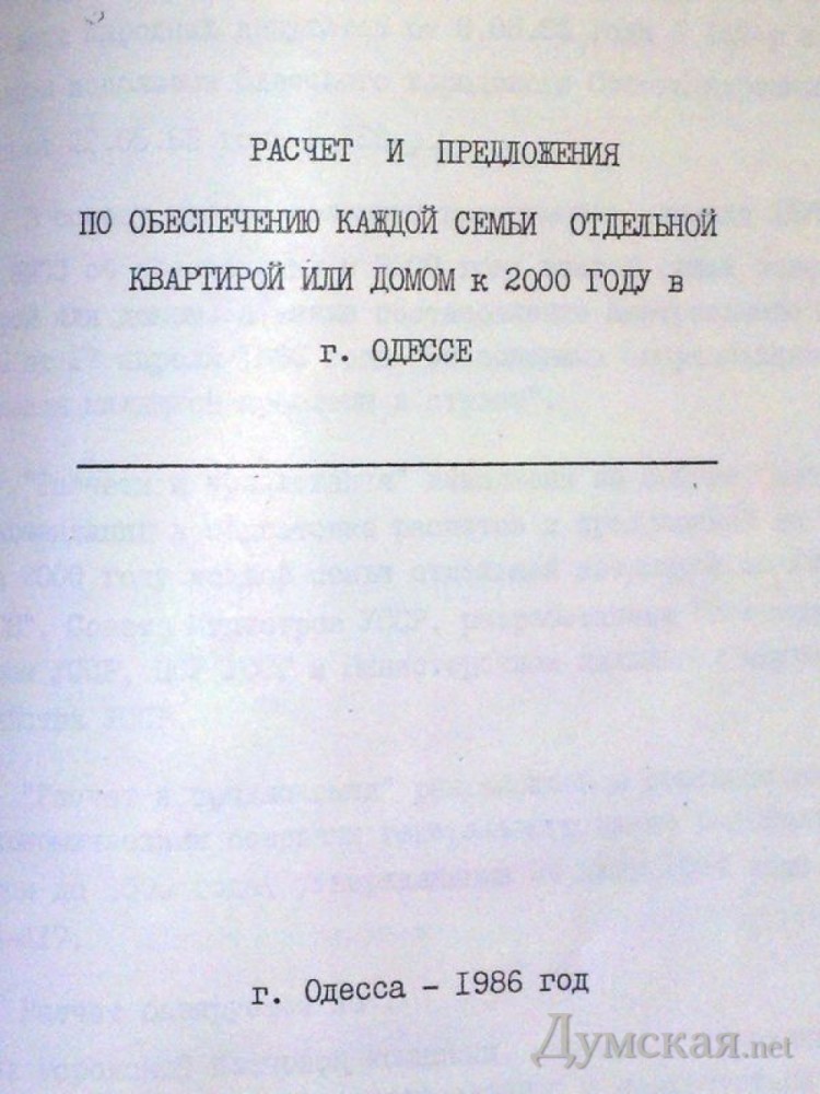 Гриф снят! Как одесские «строительные короли» выполняют решения XXVII съезда КПССВ распоряжение «Думской» попали секретные документы советской эпохи. Касаются они не вопросов размещения ракетных баз и производства танков с самолетами, а гораздо более насущных проблем — размещения жилых районов и строительства новых домов . Как партия и правительство собирались решать жилищную проблему? Что было бы, воплотись решения XXVII съезда КПСС в жизнь? И почему сопоставимые с заданными советской властью темпы строительства жилья сегодня ни на йоту не приближают Город к реализации заветной мечты — каждой семье по квартире? Об этом — наш сегодняшний рассказ. Обеспечить каждую советскую семью отдельной квартирой самым первым пообещал в 1961 году Никита Хрущев. Произойти это должно было к 1980 году — запланированной дате построения коммунизма. Обещание генсека заметно отразилось на облике советских городов. Деревня Черемушки к юго-западу от Москвы, застроенная новыми домами, дала свое имя множеству аналогичных районов по всей стране, в том числе и юго-западному жилмассиву Одессы. Символом эпохи стали «хрущевки» — знаменитые обезличенные дома до пяти этажей, лишенные любых «архитектурных излишеств», в которые в 1960-е годы с удовольствием переселялись жители многочисленных бараков и коммуналок. Увы, вместо обещанного коммунизма в 1980 году в Москве прошли Олимпийские игры. Эстафету квартирных обещаний принял Михаил Горбачев. В обстановке всеобщего ускорения в 1986 году XXVII съезд КПСС принял историческое решение — к 2000-му году каждая советская семья должна иметь отдельную квартиру. Старшее поколение помнит, что планы партии у нас автоматически становились планами народа, и весь народ в едином порыве немедленно начинал претворять их в жизнь. Естественно, в первых рядах строителей светлого будущего «в окошках отдельных квартир» стояли архитекторы, строители и работники советских органов, которые должны были решать: где, сколько и какого жилья нужно построить, чтобы выполнить программу социально-экономического развития СССР на 1986-1990 годы и на период до 2000 года. Не отставали от всех советских людей и одесситы. Заместитель председателя горисполкома товарищ Валерий Мазурин в обстановке всеобщей гласности подготовил «Расчет и предложение по обеспечению каждой семьи отдельной квартирой или домом к 2000 году в г. Одессе». Он не публиковался в печати, но лег в основу генерального плана 1989 года. Строго говоря, по этому документу мы живем до сих пор. Чтобы вы могли оценить масштаб запланированного, позволим себе привести немного цифр. Если считать квартирами, то в 1986 году в Одессе их было 300 тысяч, в том числе 20 тысяч коммунальных. Всего в улучшении жилищных условий нуждалось 116 тысяч семей (очередники и жители «коммун») .С учетом сноса аварийного жилья, переоборудования коммуналок и ожидаемого роста населения, за 14 лет нужно было построить 172 тысячи новых квартир. Если измерять квадратными метрами, то в дополнение к имеющимся 15,3 миллионам предстояло в сжатые сроки построить еще 11,2 миллиона «квадратов». Другими словами, чтобы удовлетворить потребности нуждающихся, в Одессе должен был появиться еще один крупный город. Стоить собирались отнюдь не тесные «хрущевки». По плану, средняя площадь новой квартиры должна была составлять 58 кв.м., а стоимость одно