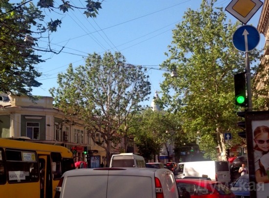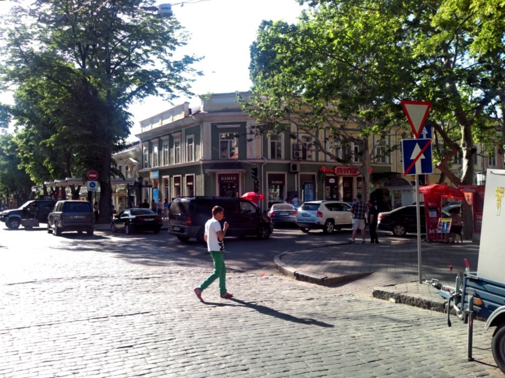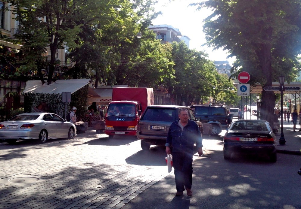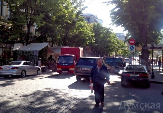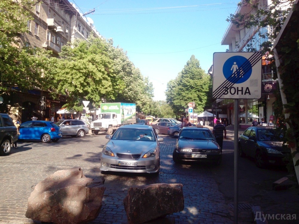 Конфликтная ситуация, произошедшая на днях на Дерибасовской, куда пытался проехать на своем «Порше» одесский ресторатор Андрей Левинец, вызвала бурную дискуссию в соцсетях и наших комментариях. В связи с этим обозреватель «Думской» Сергей Дибров предлагает вспомнить Правила дорожного движения. Когда-то по Дерибасовской колесили автомобили и троллейбусы, но три десятка лет назад эта улица стала пешеходной. Сегодня езда и парковка на Дерибасовской улице, точнее на участке от Преображенской до Екатерининской, превратились в культовую одесскую тему. Для одних возможность прокатиться с ветерком возле Горсада — признак «крутизны», для других — неуважение к родному городу. Дорожные знаки у нас традиционно не помогают, поэтому для ограничения движения по пешеходной улице используют каменные блоки, клумбы и цепи. Но совсем «наглухо» перекрыть квартал невозможно — там работают магазины, живут люди, туда должны при необходимости попадать скорые, пожарные и обслуживающие автомобили. Поэтому со стороны Екатерининской оставили проезд. Пока там дежурил пост внутренних войск (ныне — Нацгвардия) — все было нормально, но в прошлом году он исчез. Относительный порядок удалось навести несколько недель назад, когда на перекрестке появились люди в камуфляжной форме с повязками «Охрана порядка». Они стали пропускать только тех, кто имеет на это право. Однако проблема остается острой — несколько дней назад конфликт между охранниками порядка и автолюбителем, который работает в пешеходной зоне, едва не закончился дракой. Я попытался проехать по Дерибасовской, вникнуть в логику дорожных знаков и выяснить, кто же имеет право заезжать в «пешеходный квартал» главной улицы города. Дерибасовская — не самая большая улица Одессы, меньше километра. Но зато здесь есть участок с двусторонним движением (от улицы Леха Качинського до Пушкинской), два квартала с односторонним движением (от Пушкинской до Екатерининской), и наконец пешеходная зона на участке от Екатерининской до Преображенской. Из всего этого разнообразия нас интересует пересечение улиц Дерибасовской и Екатерининской. Это непростой перекресток: двусторонняя Екатерининская тут превращается в одностороннюю (через квартал, после пересечения с Ланжероновской, она снова станет двусторонней), а односторонняя Дерибасовская упирается в тот самый «проблемный» въезд. На этом перекрестке водителя встречают сразу два дорожных знака, которые, сразу скажем, противоречат друг другу. Первый — знак 3.21 «Въезд запрещен», именуемый в простонародье «кирпич». Как следует из названия, под него запрещен въезд любого транспорта. Правила дорожного движения требуют ставить такой знак на дорогах с односторонним движением, над встречными полосами, над въездами и выездами со стоянок и АЗС, чтобы не допустить движения навстречу потоку. Вопреки распространенному заблуждению, въезд под этот знак не разрешен никому, то есть совсем-совсем никому — ни жильцам, ни машинам, которые обслуживают здешние предприятия. Исключение предусмотрено только для транспортных средств, которые движутся по установленному маршруту — например, по выделенной полосе. По логике ПДД, установка этого знака говорит о том, что заезжать за него никак нельзя — впереди встречка, то есть на следующем квартале одностороннее движение нав