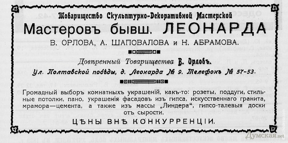 Владельцы помещений дома №9 по Канатной реставрируют выходящий на улицу фасад этого здания, являющегося памятником архитектуры местного значения. Ход работ зафиксировал корреспондент «Думской». Так называемый доходный дом Леонарда был построен в начале XX века по проекту архитектора Моисея Линецкого. Здание «иллюстрирует постепенный переход от сухого академизма эклектики того периода к более свободным и чувственным формам раннего модерна», отмечает портал «Архитектура Одессы». Первыми владельцами дома были братья Карл и Георгий Леонард. В здании размещалась скульптурно-мраморная мастерская и зеркальная фабрика. Во второй половине 1900-х годов оба предприятия вместе с домом переходят в собственность Августа Легера и не меняют владельца вплоть до революции. В середине 1900-х годов часть жилых и конторских помещений сдавалась в аренду. Незадолго до смены владельцев в доме практиковал врач Август Александрович Шварц (сведения о нем исчезают в 1907 году). После 1907 года здесь квартировал инспектор РОПиТ (Российское общество пароходства и торговли) по эксплуатации Александр Николаевич Смирнов, а между 1907 и 1909 годами на Канатную, 9 переехала химическая фабрика инженера-химика И. Крамера, рекламу которой можно найти в справочной периодике, изданной до 1913 года. Фабрика специализировалась на фруктовых эссенциях и пищевых красителях «для пищевыхъ продуктовъ, конфектъ, кондиторск. издѣлiй, ликеровъ, сироповъ, консервовъ, масла и проч.». После революции здание не избежало судьбы большинства домов центра Одессы — перепланировки и реконструкции в связи с «уплотнением», в результате чего интерьеры особняка были почти полностью утрачены. Фасад дома, напротив, дошел до наших дней в практически неизменном виде и даже сохранил лепной картуш с вензелем первых владельцев («L» — Leonard). К 2000-м годам лицевое крыло перестало исполнять жилые функции и ныне практически целиком занято офисами различных организаций. СМЕРТЬ РОСІЙСЬКИМ ОКУПАНТАМ! Помітили помилку? Виділяйте слова з помилкою та натискайте control-enter |