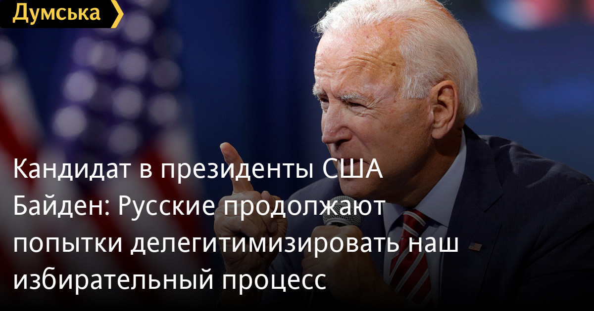 Кандидат в президенты США Байден: «Русские продолжают попытки делегитимизировать наш избирательный процесс»Кандидат в президенты США Джо Байден заявил, что имеет данные о попытках России вмешаться в предстоящие выборы. Об этом сообщает «Цензор.НЕТ» со ссылкой на Reuters. «Мы знали раньше, и я гарантирую вам, что знаю сейчас, потому что теперь я снова получаю информацию. Русские продолжают попытки делегитимизировать наш избирательный процесс. Это факт», — заявил Байден. Он предупредил, что если Россия продолжит вмешиваться, ей «придется заплатить реальную цену», если он победит на запланированных на 3 ноября выборах президента США. СМЕРТЬ РОССИЙСКИМ ОККУПАНТАМ! Заметили ошибку? Выделяйте слова с ошибкой и нажимайте control-enter |