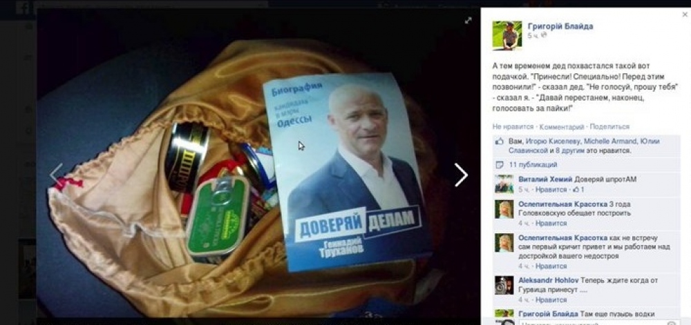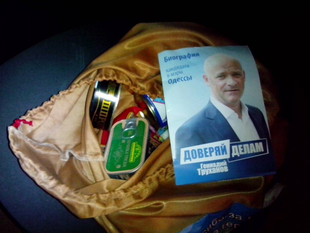 Кроме того, продолжают общественники, по домам одесситов уже начали разносить продуктовые наборы с агитационной продукцией Труханова.