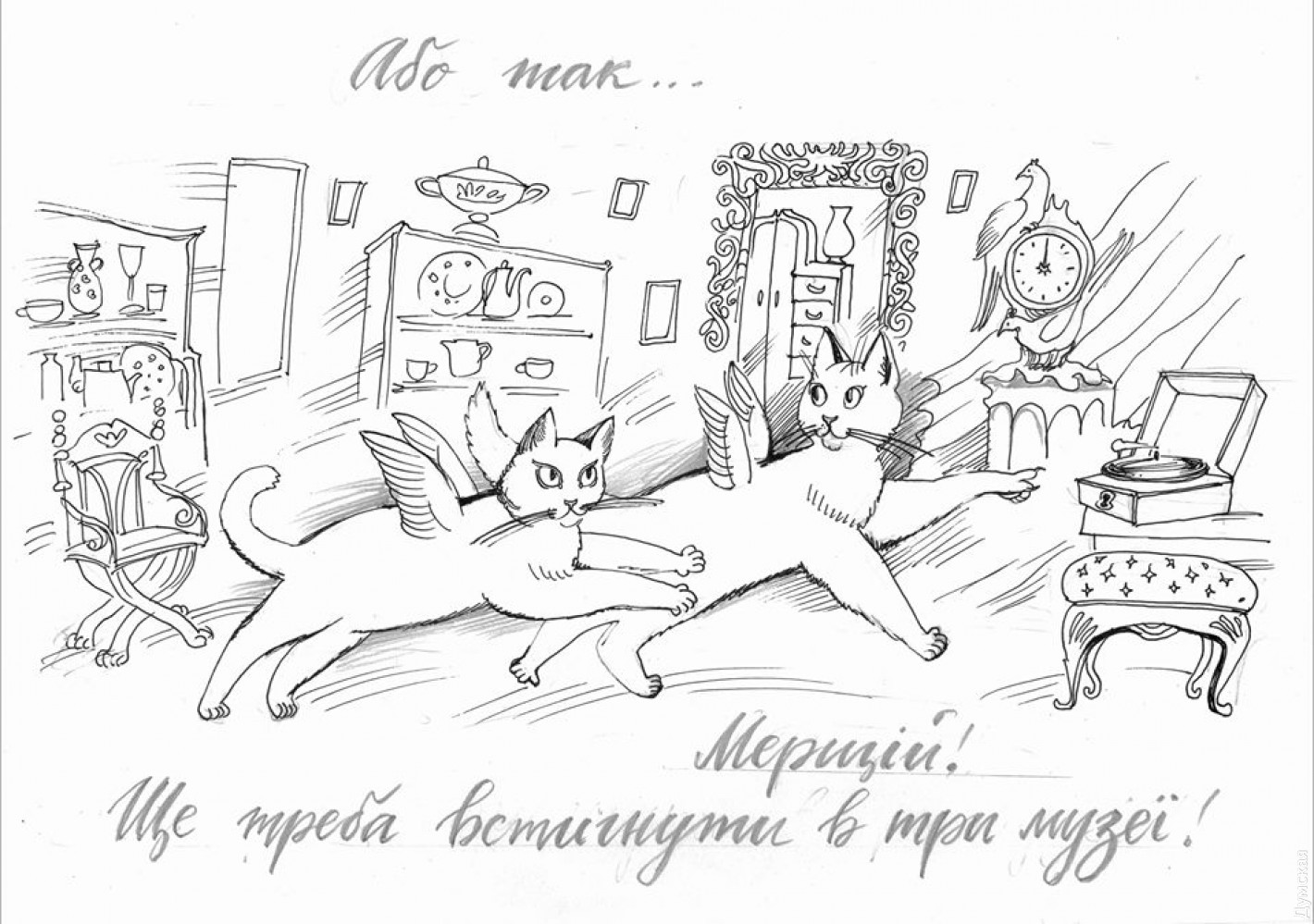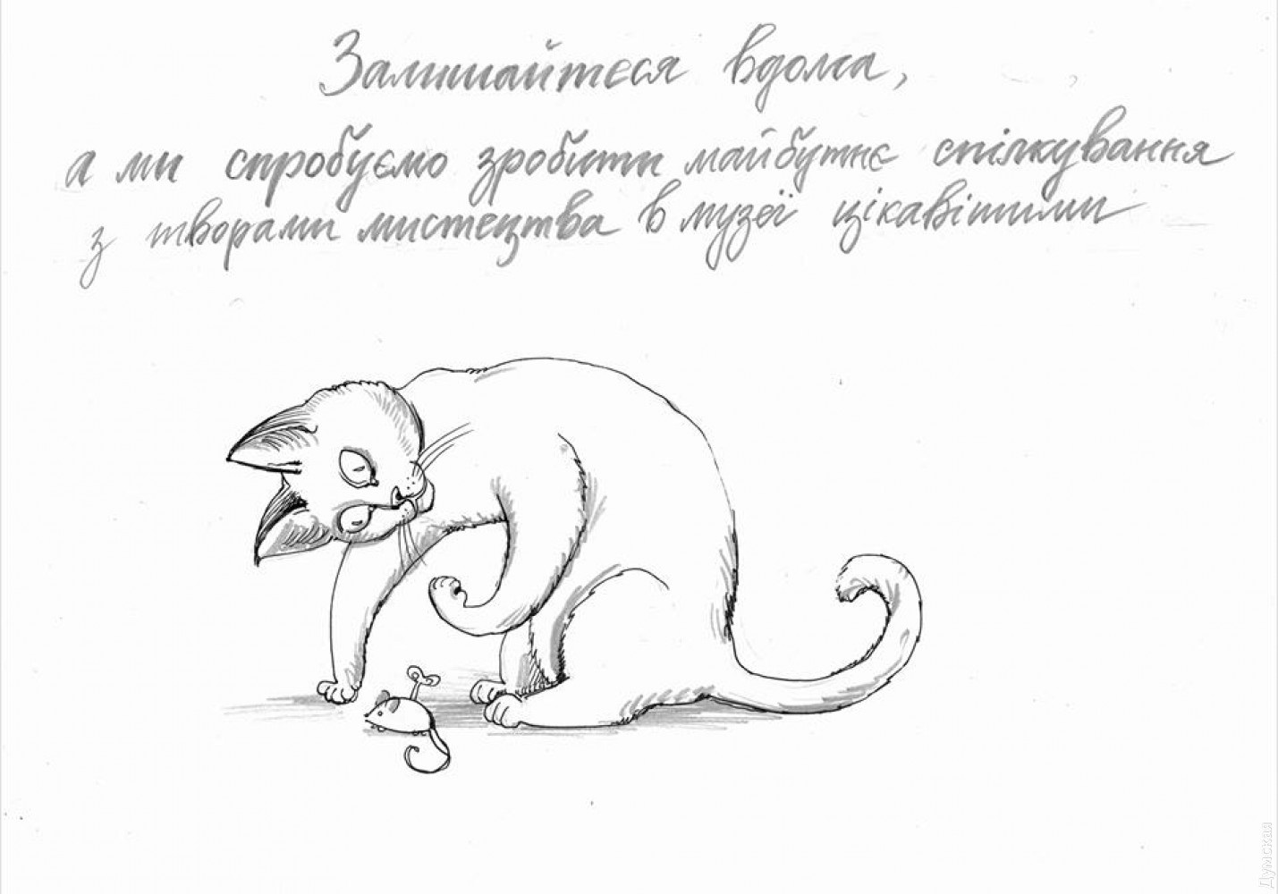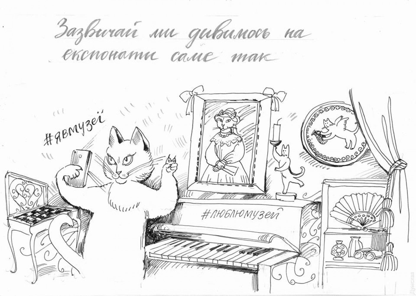 «Экспонаты музея, действительно, красиво смотрятся в рисунке. Но чего-то не хватало — персонажа, который мог бы оживлять истории. И такой персонаж появился. Прототипом стала музейная кошка Мария Дворская-Брехунец. Она прекрасно коммуницирует с посетителями на открытиях выставок и больших мероприятиях вроде Ночи Музеев. Маруся приветлива и деликатна».