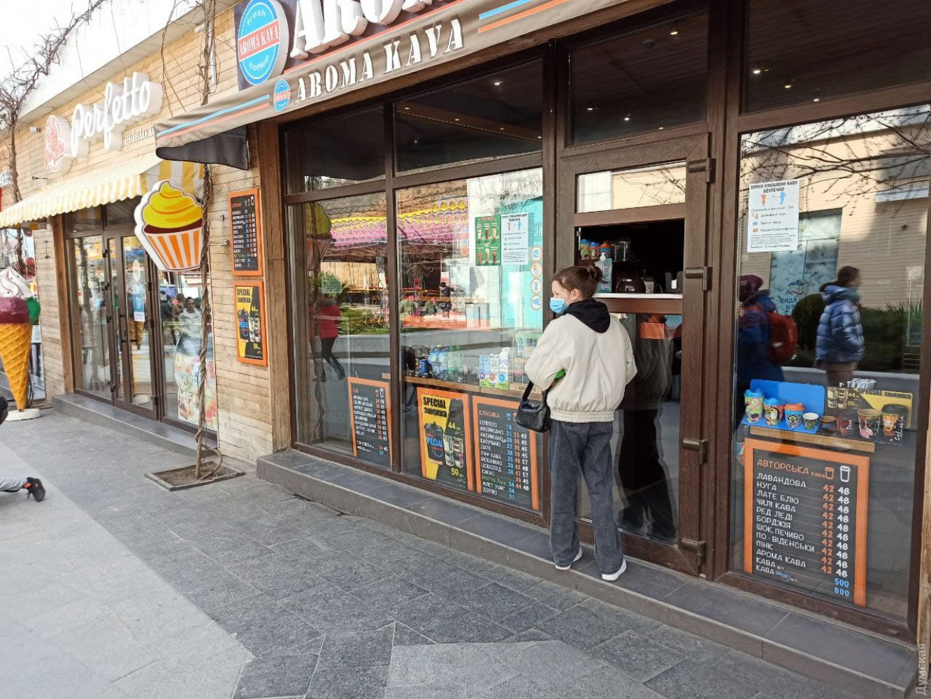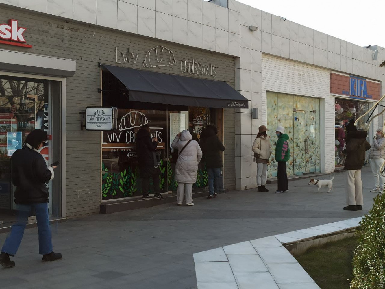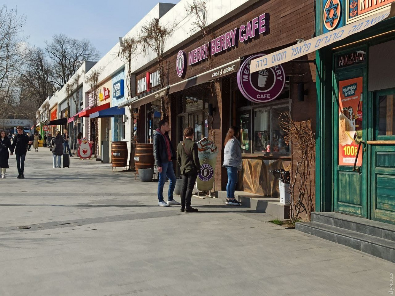 Кафешки на главной аллее почти все открыты, но работают на вынос. Впрочем, если в январе очереди за стаканчиком латте и круассаном выстраивались на улице, то сегодня многие заведения еще запускали клиентов внутрь.
