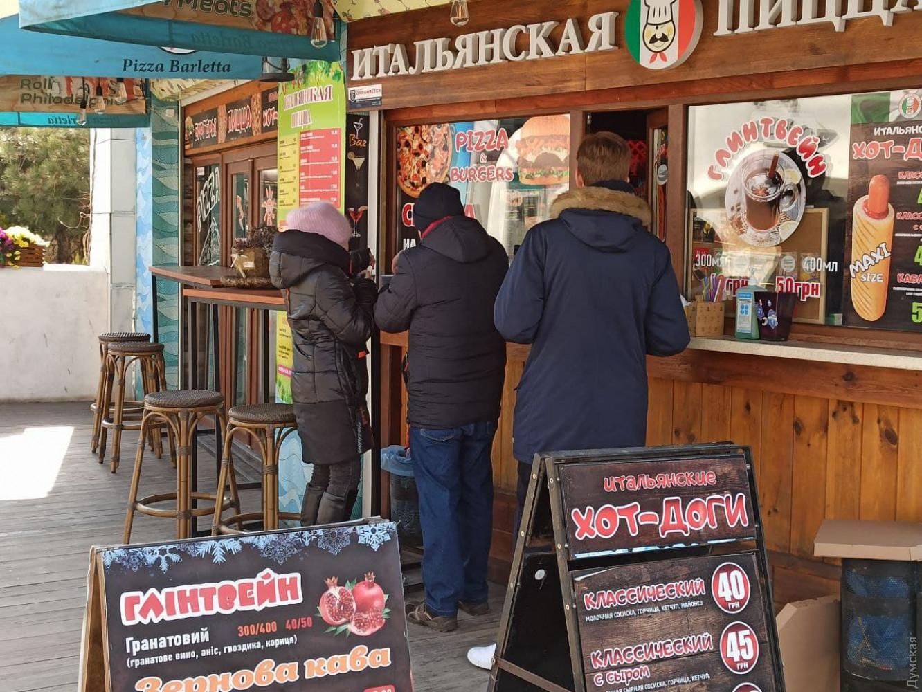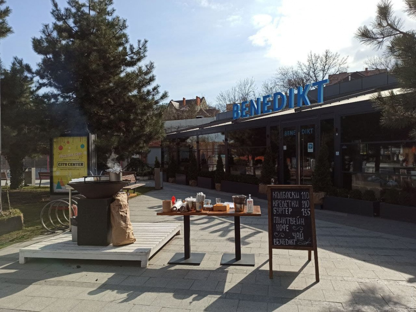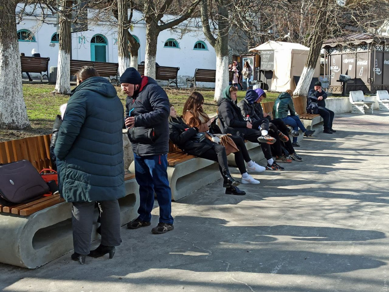 Кафешки на главной аллее почти все открыты, но работают на вынос. Впрочем, если в январе очереди за стаканчиком латте и круассаном выстраивались на улице, то сегодня многие заведения еще запускали клиентов внутрь.
