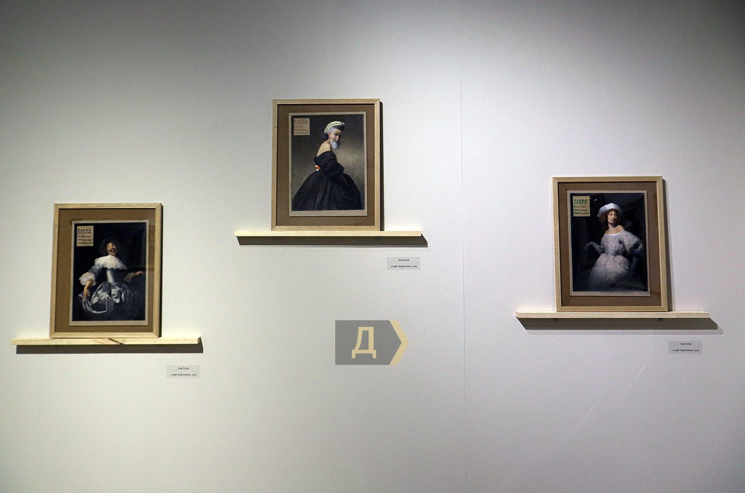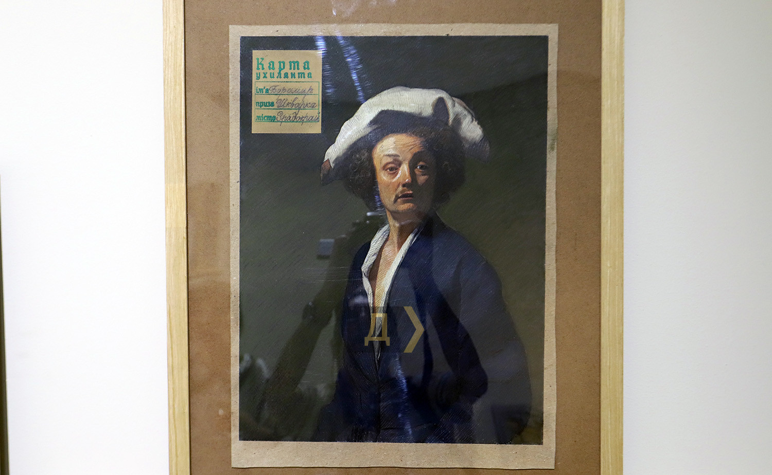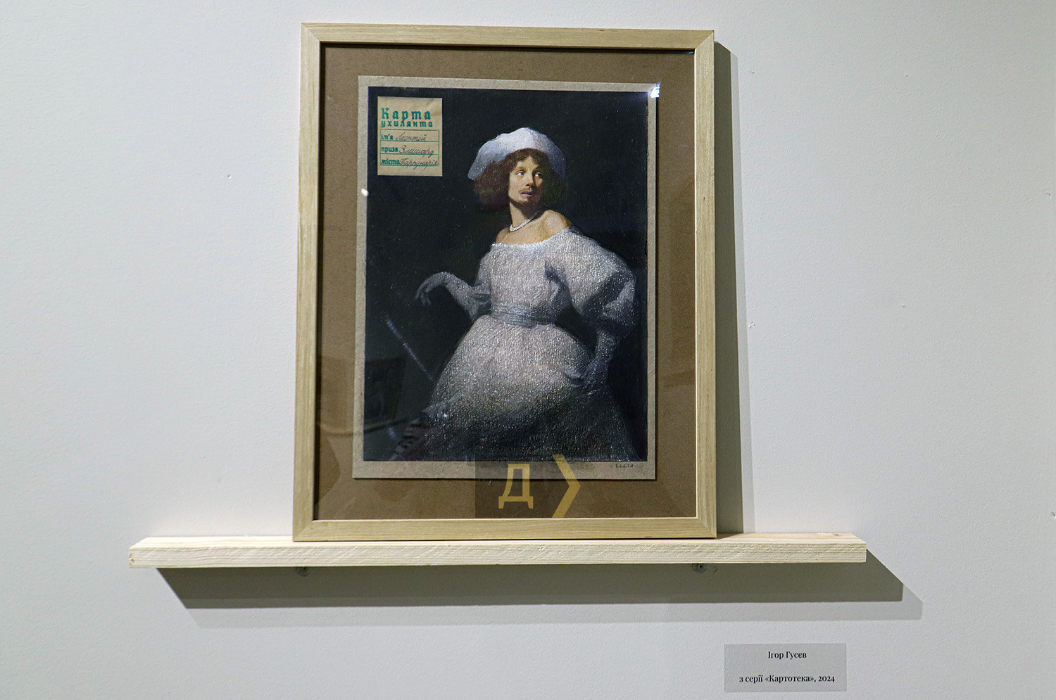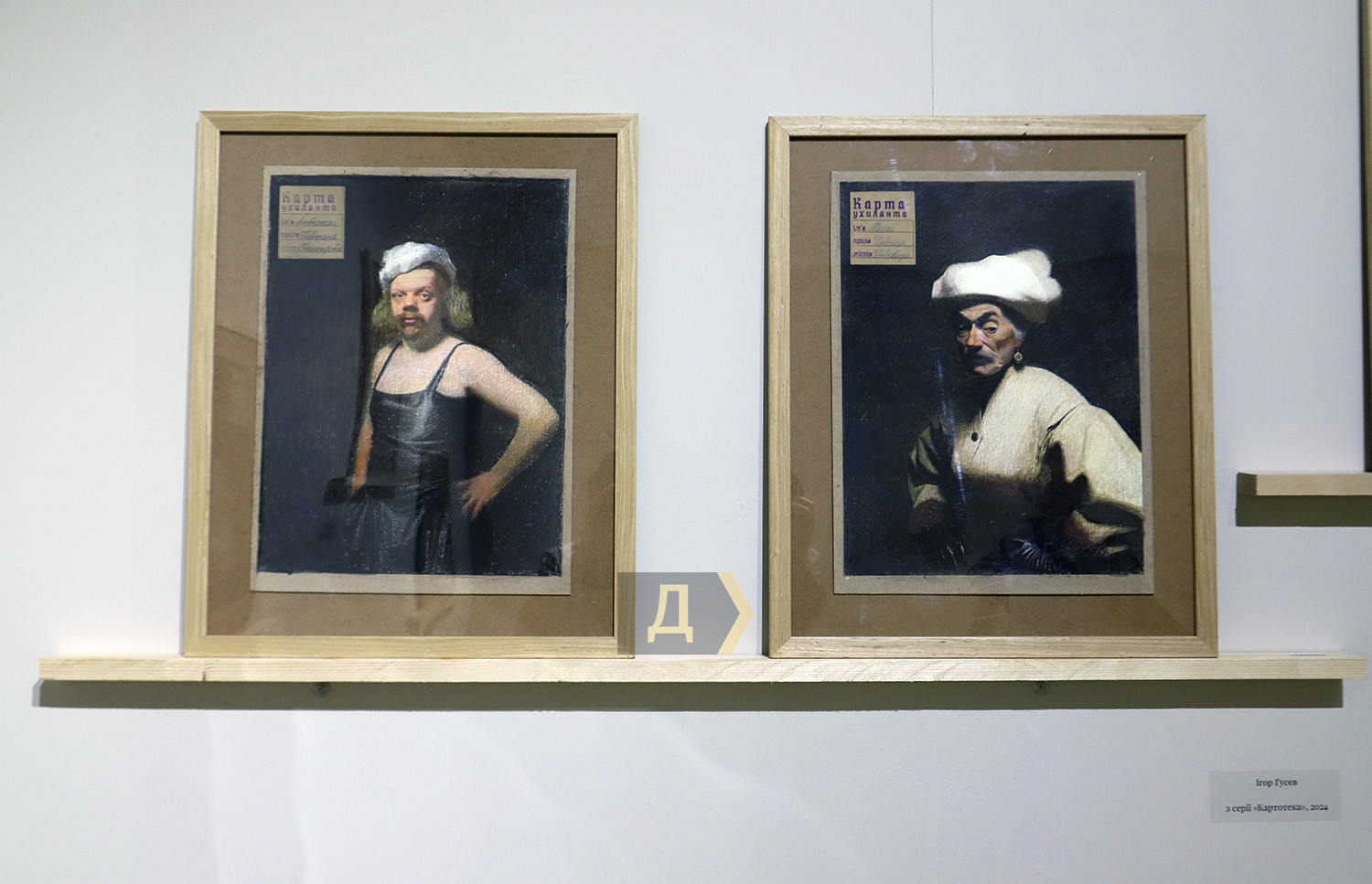 Експозицію відкриває майже викривальна «Картотека» — графіка про драматичні стратегії виживання, де гротескні перевдягання оголюють межу між страхом, іронією та прагненням свободи. Поряд із стилізованими зображеннями чоловіків у строях дам далекого минулого містяться вигадані дані, з яких ми можем зрозуміти, що перед нами Боромир Шкварка із Зрадокраю, Орест Хитронога з Кібербудяку, чи то Леонтій Зміїморд із Гарпунарію, а кожен аркуш оформлений як «Картка ухилянта». Всі ці галантні особи очевидно потребують захисту, як захисників їх сприймати неможливо, то ж і на показове засудження не заслуговують. Хай собі живуть.