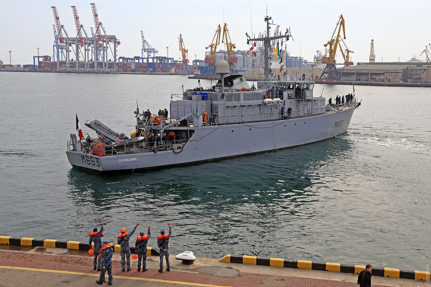 Сегодня в 10:30 французский тральщик M653 Capricorn отчалил от 16 причала морвокзала и ушел из Одессы. Чуть раньше с Западной ВМБ в открытое море вышел катер «Прилуки», который проведет с французом учения. Перед отплытием на борт тральщика поднялись наши военные моряки, чтобы организовать взаимодействие с французскими коллегами, передает корреспондент «Думской». Учения будут посвящены в основном отработке приемов по поиску мин. Наши специалисты познакомятся с работой французского оборудования, в том числе с подводными аппаратами, которые есть на вооружении «Каприкорна». Также «Прилуки» отработает с гостем упражнения по программе PASSEX — взамодействие, маневрирование, перестроения и передачу грузов на ходу. Учения продлятся несколько дней. Фото Сергея Смоленцева СМЕРТЬ РОСІЙСЬКИМ ОКУПАНТАМ! Помітили помилку? Виділяйте слова з помилкою та натискайте control-enter |