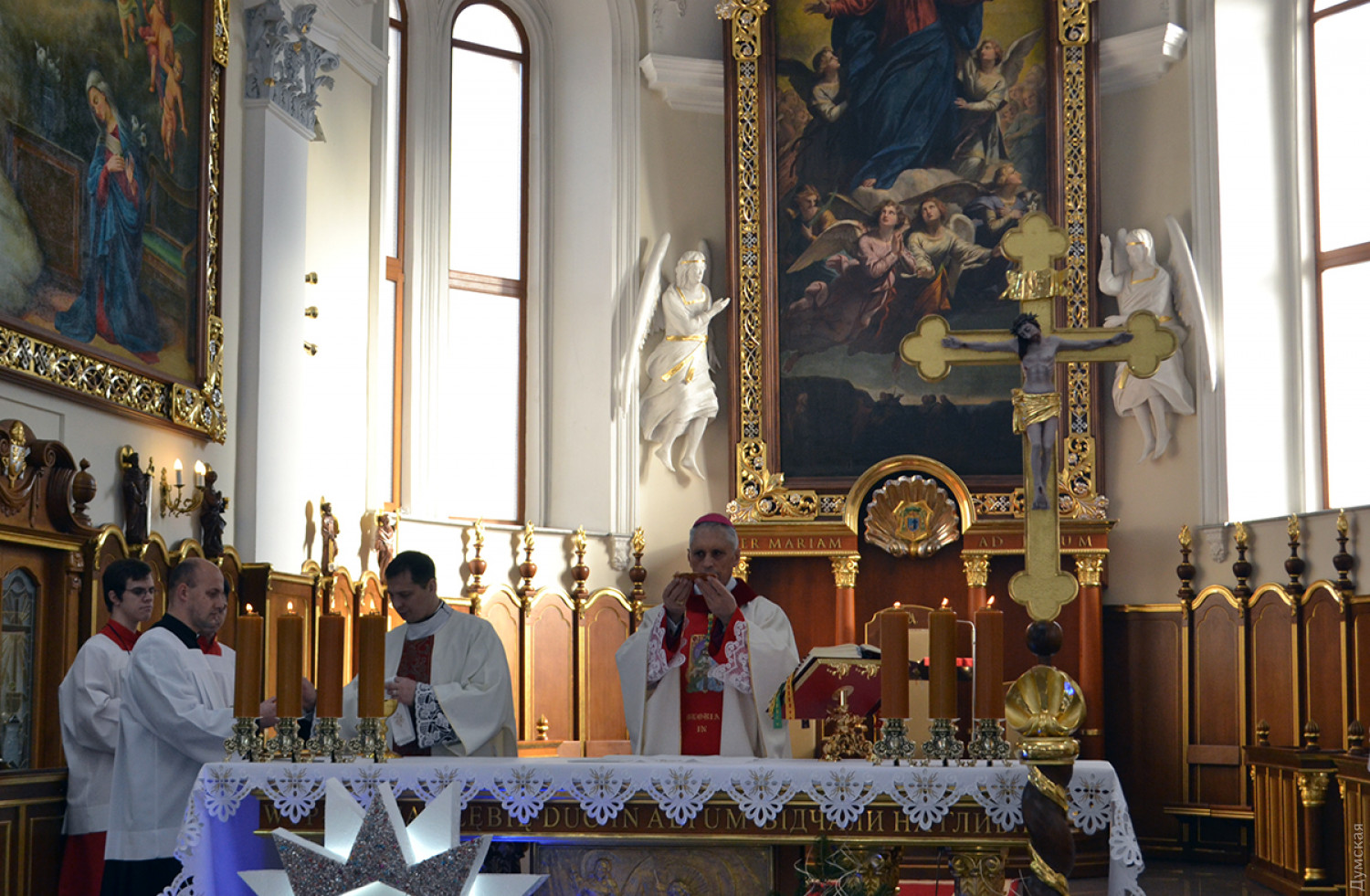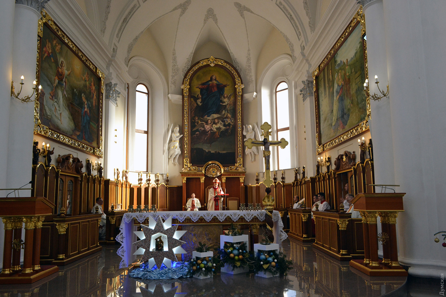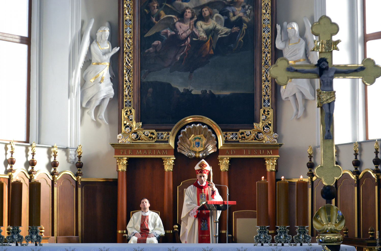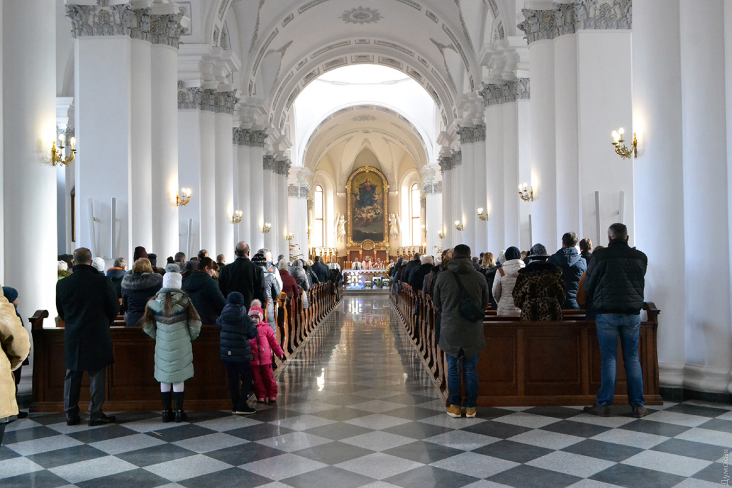 Как передает корреспондент «Думской», в 9:00 была месса на русском, в 11:00 — на польском, а будут служить на украинском языке. Мы посетили «польскую» литургию, которую вел епископ Одесский и Симферопольский Бронислав Бернацкий. Собор был переполнен. Некоторым пришлось стоять.