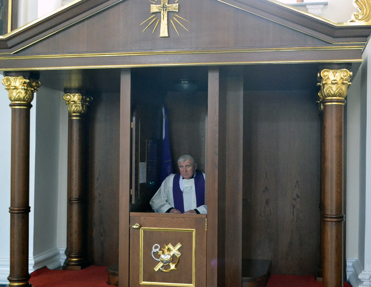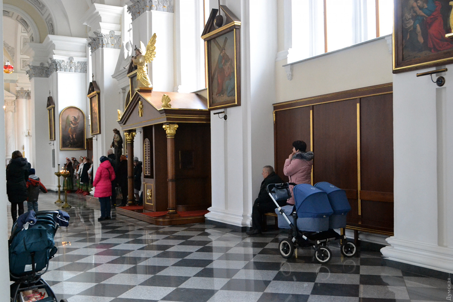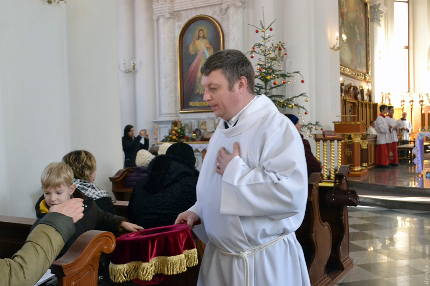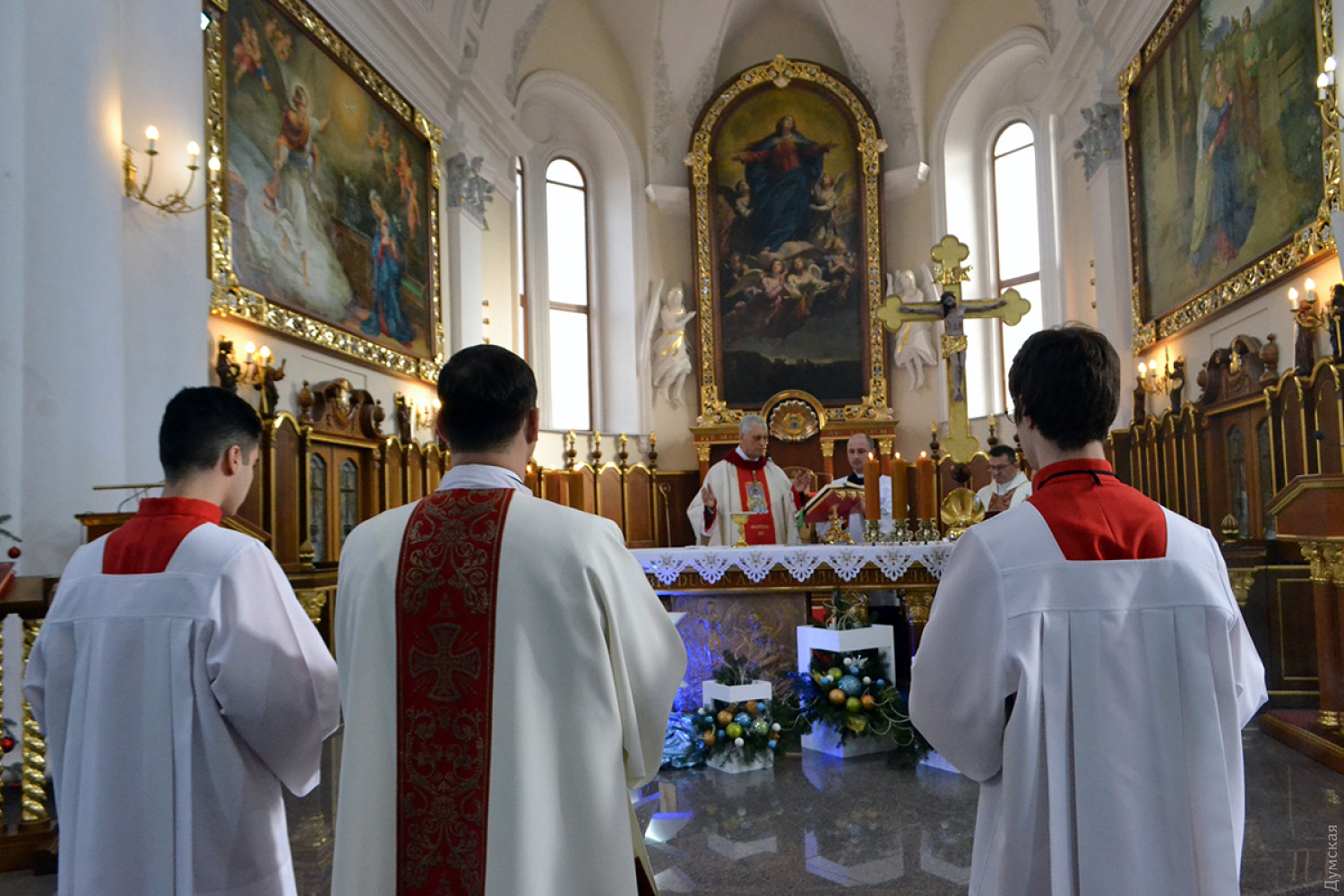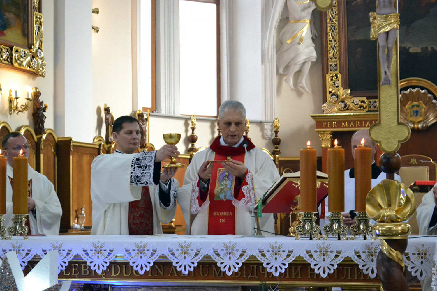 Как передает корреспондент «Думской», в 9:00 была месса на русском, в 11:00 — на польском, а будут служить на украинском языке. Мы посетили «польскую» литургию, которую вел епископ Одесский и Симферопольский Бронислав Бернацкий. Собор был переполнен. Некоторым пришлось стоять.