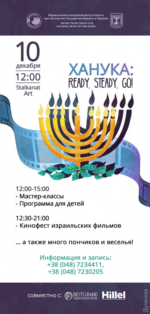 Так, 10 декабря одесситов приглашают на самое яркое мероприятие года «Ханука»: ready, steady, go!». В программе – кинофестиваль израильских фильмов, мастер-классы, угощения и сотни подарков.
