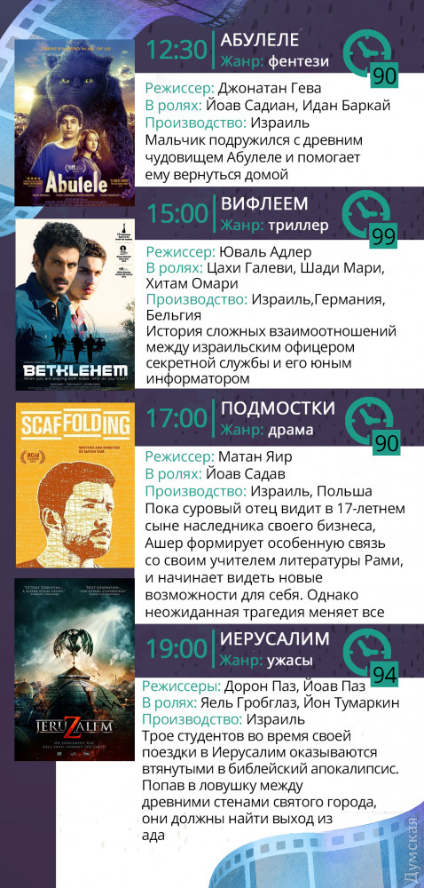 Параллельно с развлекательной программой, в 12:30, начнется фестиваль израильского кино: к просмотру предлагаются четыре фильма в разных жанрах, отмеченные национальными израильскими премиями и представленные на международных кинофорумах.