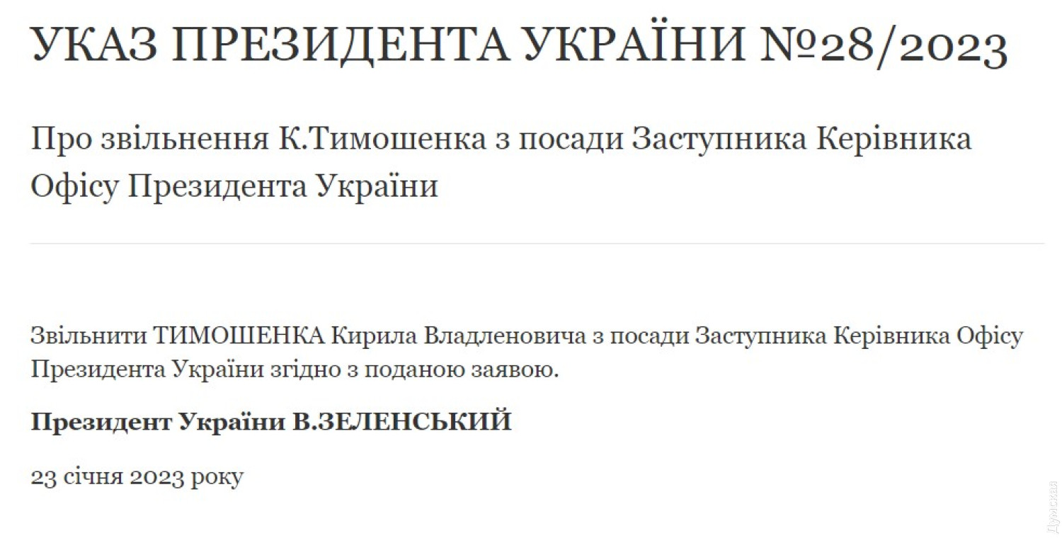 Кирила Тимошенка звільнили з ОП, – указ президента (документ)Президент України Володимир Зеленський звільнив заступника голови Офісу президента Кирила Тимошенка з займаної посади. Про це свідчить указ голови держави, датований 23 січня. «Звільнити Тимошенка Кирила Владленовича з посади Заступника Керівника Офісу Президента України згідно з поданою заявою». Раніше джерела про звільнення Тимошенка повідомляв нардеп Олексій Гончаренко. СМЕРТЬ РОСІЙСЬКИМ ОКУПАНТАМ! Помітили помилку? Виділяйте слова з помилкою та натискайте control-enter |
