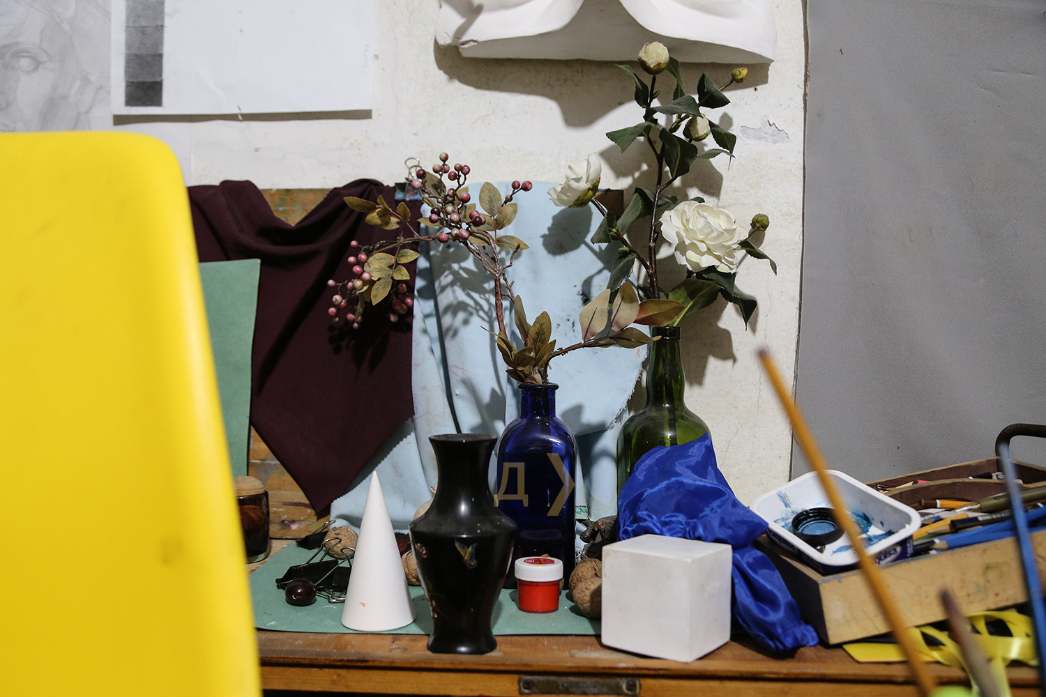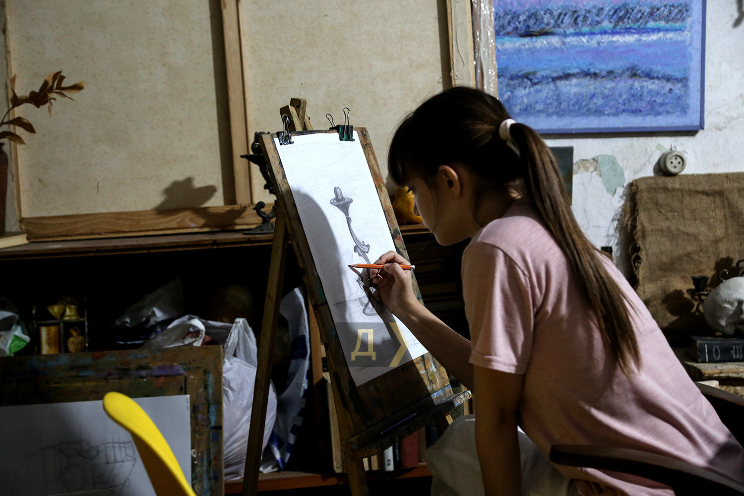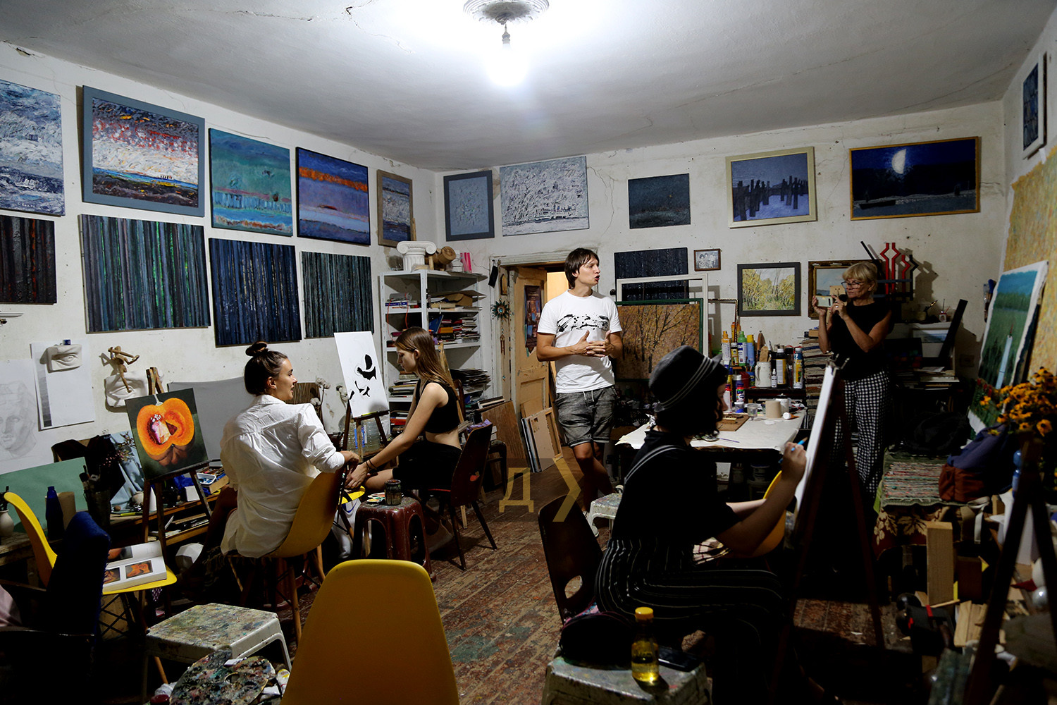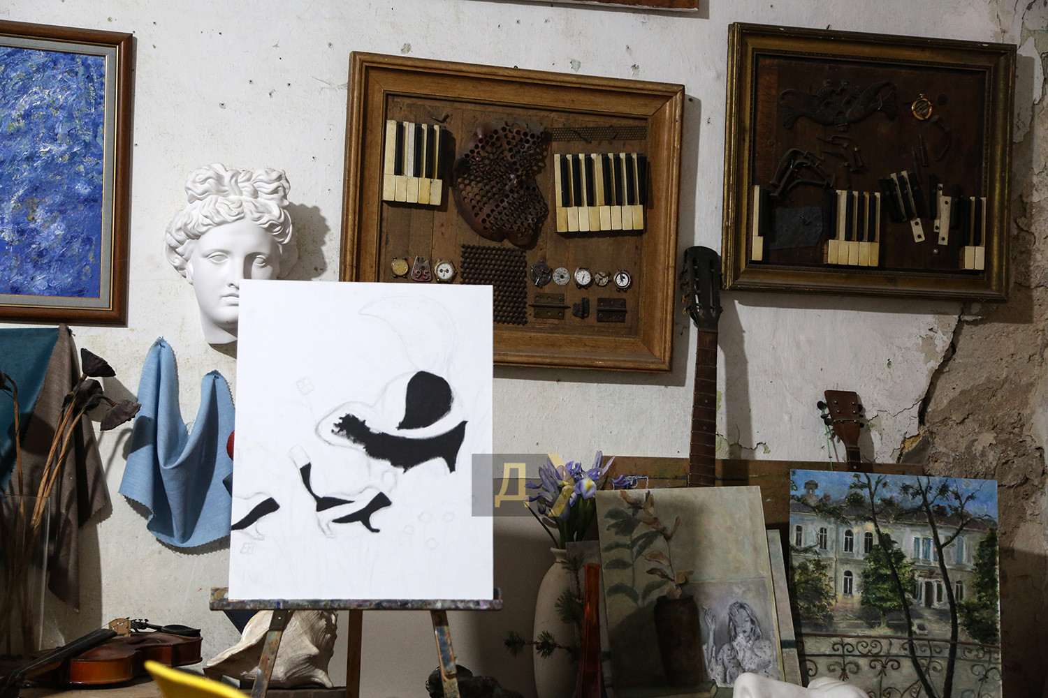 Пензликом та олією проти путіна: як в Одесі вчаться малювати і ховаються під час повітряних тривогМаленькі майстерні у напівпідвалі у самому центрі Одеси. Колись їх роздавали від Спілки художників, зараз усе тримається на чесному слові та за старою пам'яттю. Саме тут побувала кореспондент «Думської», щоби переконатися, що навіть під час війни творче життя у місті триває, незважаючи на повітряні тривоги. Тут знаходиться майстерня одразу двох одеських художників Ігоря Божка та його сина Сергія. Обидва — відомі автори, у кожного є свої шанувальники та шанувальниці. Ігор пережив Другу світову війну дитиною та добре її пам'ятає. Закінчив нашу Греківку ще в середині 1960-х, і вже тоді писав нонконформістські роботи та приймав активну участь у неформальних рухах. Пише вірші та талановиті картини, робить колажі та інсталяції. Частина робіт Ігоря Божка перебувають у його майстерні – вони надихають тих, хто приходить. Сергій – його син та учень. Після початку повномасштабного вторгнення повернувся до творчості в середині березня. «Пройшов перший шок і я зрозумів, що не можу не малювати — треба було висловитися хоч пензликом по полотну», — сміється Сергій. Одна з робіт молодого художника «Зацвіли вишні» — на полотні справді цвітуть дерева, але в об'єктив відеокамери безпілотника видно не лише їх, а зруйноване місто — розбиті будинки та знищена техніка ворога з літерами z та v. «Це була рефлексія на новини, на те, що відбувалося навколо. Перше усвідомлення — якого біса вони сунулися до нас, на нашу землю і полізли все руйнувати, красти та ґвалтувати», — розповідає Божко-молодший. А потім був один із прильотів до Одеси, і від ударної хвилі в картину «Дотримуйтесь спокою. Працює ППО» потрапили пензлики, пробили полотно і так там і залишилися. «Я написав про цей випадок на Фейсбуці і виклав фото. Спочатку хотів витягнути і залишити роботу з дірками — як символ війни. Мовляв, і картини зазнають поранень. Але потім вирішив, що нехай буде так, як трапилося, — ділиться художник. — А потім цю картину і купили. Соцмережі — найкращий маркетолог, зараз художникам не дуже солодко доводиться, адже потрібніше купувати дрони та тепловізори для наших захисників, а не живопис та графіку». На полотні «Перші підхерсоновики» — троє російських нацистів у окопі зі вкраденим холодильником та недоїденими кавунами. Цю картину Сергій закінчив незадовго до початку контрнаступу на півдні України. Автор поєднує майстерність живописця з тонкою іронією — це він прищеплює і своїм учням. «Взагалі-то школа-студія «Штрих» у нас працює ще з 2008 року, — розповідає Божко-молодший. — Ми одні з перших почали приймати учнів. Вчимо як академічному живопису, так і вільної творчості. Немає жодних догм, є бажання бачити і втілювати прекрасне — приходь і навчайся. Я взагалі проти догм, хоча й академізм у нас виходить непогано — після наших курсів усі вступали до вузів та до Греківки, жодних нещасних випадків не було. Усі задоволені та займаються творчістю». Студія відновила свою роботу теж з середини березня – двічі на тиждень, вечорами дівчатка та хлопчики, а також дорослі люди навчаються малюнку та живопису. Зараз немає фіксованої оплати – поклади у банку, скільки зможеш – тому що війна. «До мене прийшла родина з окупованого селища під Донецьком. Я говорю — я з вас грошей не візьму. 