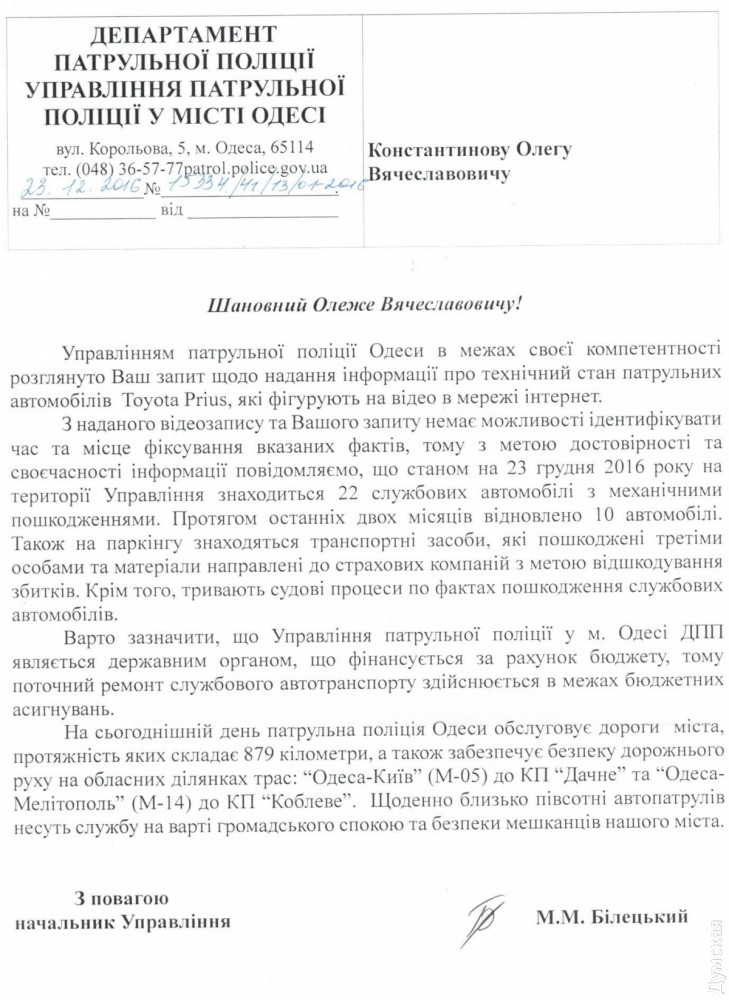Одесская патрульная полиция подтвердила наличие кладбища «Приусов»: на стоянке находится 23 поврежденных автоВ ноябре прошлого года «Думская» опубликовала видеозапись, снятую активистом общественной организации «Безопасный город» Юрием Головчуком. На видео засняли «кладбище Приусов» — стоянку, на которой хранятся поврежденные полицейские автомобили. По информации Головчука, в помещении, где проходила съемка, находилось более 30 машин с различными повреждениями. Данная публикация получила высокий резонанс, и редакция «Думской» обратилась за комментариями в патрульную полицию Одессы. Однако сотрудники ведомства согласились дать ответ только на письменный запрос. Мы отправили информационный запрос 23 ноября 2016 года и получили ответ только в январе. Как следует из полученного ответа, по состоянию на 23 декабря на стоянке находилось 23 «Приуса». В течение последних двух месяцев восстановили 10 автомобилей. Публикуем официальный ответ патрульной полиции Одессы полностью. Отметим, что закон предусматривает пятидневный срок предоставления ответа на информационный запрос. В нашем случае, судя по документам, ответ был подписан только через месяц, и еще месяц понадобился почте для доставки письма адресату. СМЕРТЬ РОСІЙСЬКИМ ОКУПАНТАМ! Помітили помилку? Виділяйте слова з помилкою та натискайте control-enter Новини по цій темі: 29 липня 2025: В Усатово Одеської області сталася перестрілка: поліція працює на місці (відео, оновлено) 28 липня 2025: П'яний на "Ягуарі" або гіпертонік? Звільнений топ-посадовець одеської поліції хоче повернутися на службу 19 червня 2025: Дівчинку, яку шукали сотні одеситів, знайшли вбитою: поліція працює з чоловіком, ймовірно причетним до загибелі 27 травня 2025: Увели гектар в університету: на Одещині засудили земельних аферистів, але без посадки і Хвоста |