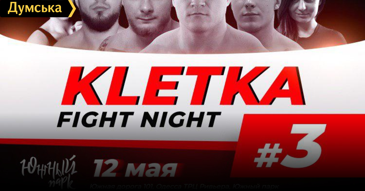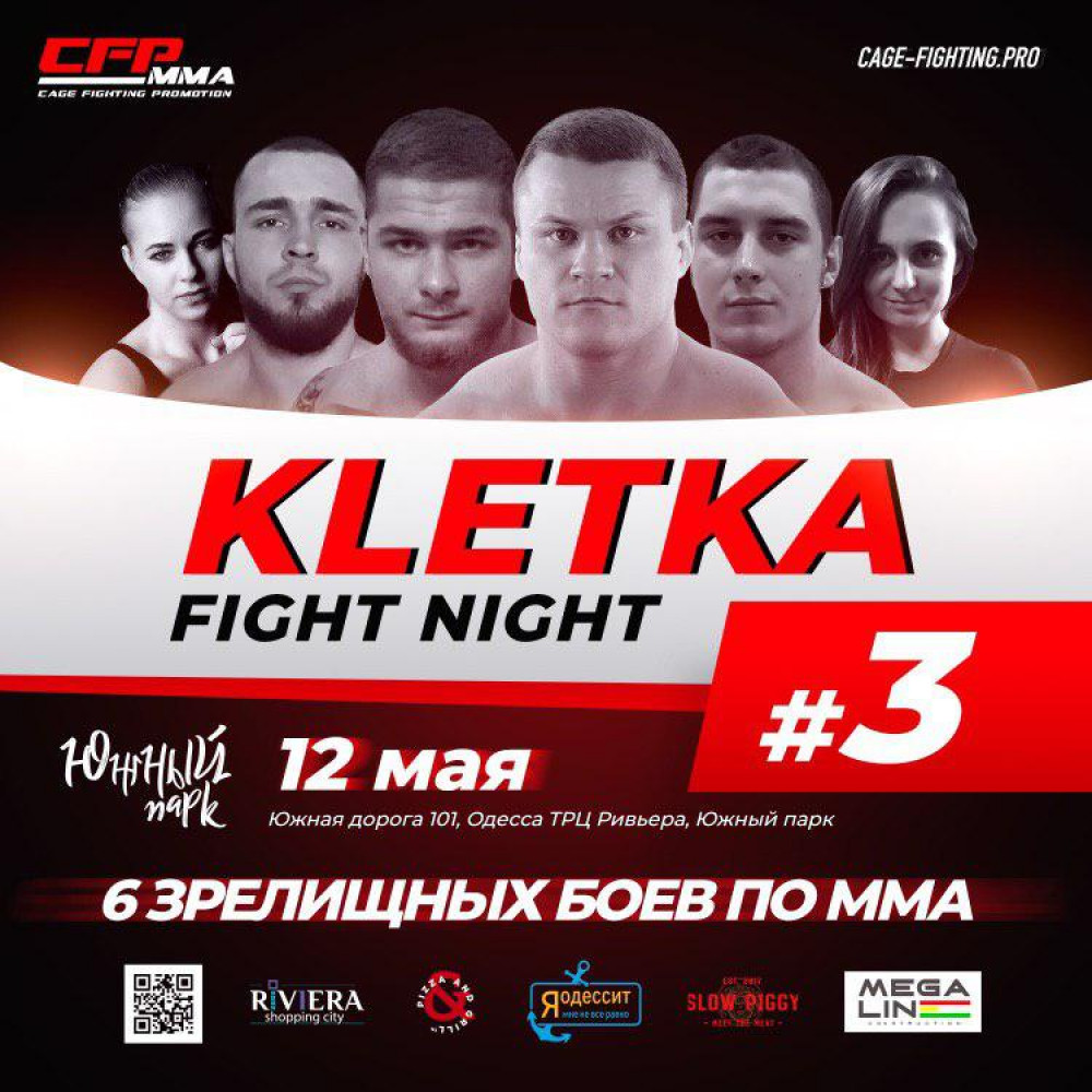 Kletka Fight Night: в Одессе проведут шесть зрелищных боев по ММА за вечер (общество)12 мая в ТРЦ «Ривьера» (Южный парк) состоится третий турнир Kletka Fight Night. Как сообщают устроители — общественная организация «Клетка» и промоутерская компания Cage Fighting Promotion, бои пройдут в шести весовых категориях — 60 кг, 61 кг, 66 кг, 74 кг, 88 кг и 100 кг. Все спортсмены представляют разные города и клубы Украины. Накануне, 11 мая, состоится пресс-конференция, открытая тренировка и взвешивание face to face. Рефери на турнире будет судья 1 категории по ММА, мастер спорта Денис Молоденко. «Цель мероприятия заключается в том, чтобы показать, какими профессиональными бойцами обладает Украина, и популяризировать бои смешанных единоборств в целом», — отмечают организаторы.