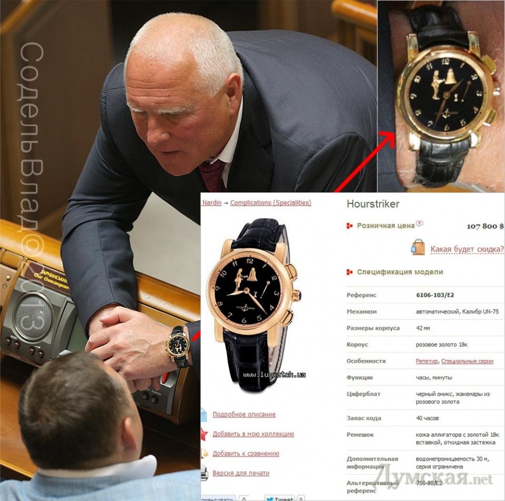 Народный депутат от Партии регионов Леонид Климов носит часы стоимостью около 100 тысяч долларов. Нардепа с часами удалось запечатлеть фотокорреспонденту Владу Соделю во время заседания Верховной Рады. Речь идет о модели Ulysse Nardin.Complications. Hourstriker. 6106-103/E2, стоимость которых варьируется от 84 до 107 тысяч долларов. Напомним, Климов является главой подкомитета по вопросам денежно-кредитной политики, валютного регулирования и взаимодействия с Нацбанком парламентского комитета по вопросам финансов. СМЕРТЬ РОСІЙСЬКИМ ОКУПАНТАМ! Помітили помилку? Виділяйте слова з помилкою та натискайте control-enter