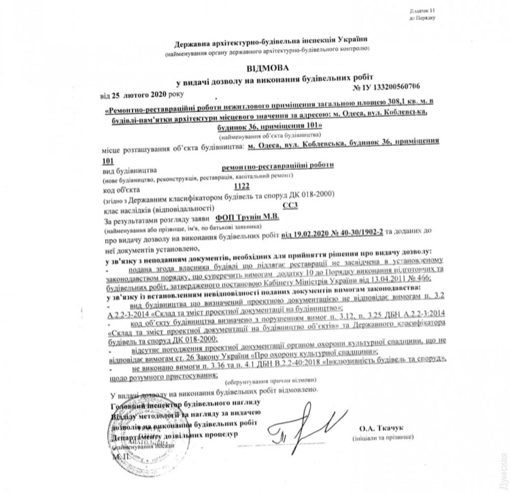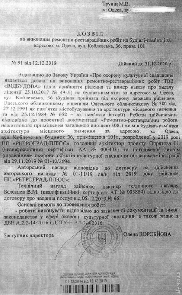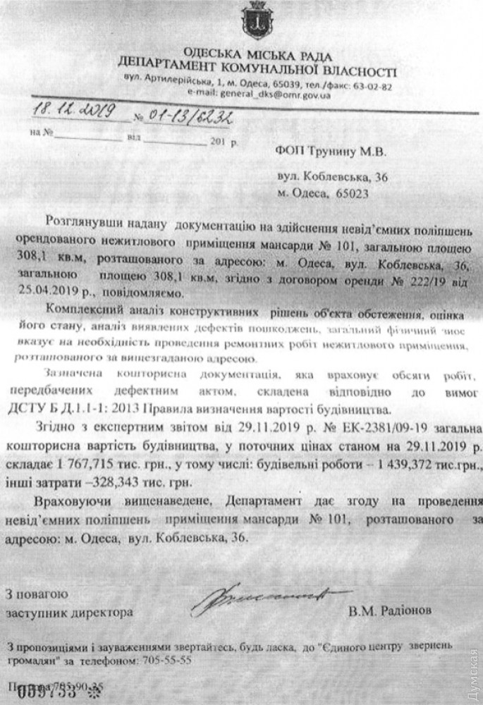 Одесская мэрия тайно передала в аренду чердак памятника архитектуры, пока жильцы протестуют из-за его реконструкции (фото, документы)Жители дома №36 по Коблевской, памятника архитектуры местного значения 1881 года постройки, несколько лет сражаются с чиновниками и собственником квартиры №4 на третьем этаже из-за ее реконструкции, сопровождающейся захватом чердака. Работы начались еще в 2018 году, но после огласки в СМИ на объект ринулись с проверками чиновники, и строительство приостановили. При этом, как утверждают жильцы, дому успели нанести существенный вред. В результате проведенных работ на фасаде появились трещины, осыпалась штукатурка. На чердаке сняли тепло-звукоизоляционный слой перекрытия, демонтировали часть коммуникаций. Доступ к нежилому помещению, как и ранее, есть только у владельцев квартиры №4, несмотря на то, что там находятся общедомовые коммуникации. Жалобы на реконструкцию и ее последствия попали даже в Офис президента, но их спустили обратно на местный уровень. Как рассказал «Думской» один из жильцов дома Владимир, летом 2020 года работы возобновились. Люди опасаются, что здание продолжит разрушаться, а на крыше все же выстроят незаконную мансарду. В управлении культуры, национальностей, религий и охраны объектов культурного наследия Одесской ОГА «Думской» подтвердили, что ремонтно-реставрационные работы были согласованы, но «без изменения конфигурации памятника и без мансарды». Пообещали, что инспектор выйдет с проверкой на объект в ближайшее время, после чего будут приняты меры. Но и это еще не все. Оказывается, пока люди обращались во всевозможные инстанции, чтобы спасти свой дом от разрушения, департамент коммунальной собственности Одесского горсовета передал чердак площадью 308, 1 кв. м в аренду некому предпринимателю Максиму Трунину. То есть в октябре 2018 года управление охраны памятников мэрии проводит комиссионное обследование и фиксирует факт незаконных работ на чердаке, а в апреле 2019 года, спустя полгода, департамент коммунальной собственности передает объект в аренду, зная о конфликте с жильцами. Более того, в конце 2019 года департамент коммунсобственности дал добро на «осуществление неотъемлемых улучшений арендованного помещения». Иными словами, городские чиновники заложили правовую основу для дальнейшего отчуждения этого объекта без конкурса. По нашим данным, в декабре 2019 года Трунин получил разрешение на ремонтно-реставрационные работы в помещении №101 (подрядчик — ООО «Відбудова», автор проектной документации ЧП «Ретроград-плюс»). Вместе с тем, ГАСИ Украины, которая выдает согласия на выполнение работ в памятниках архитектуры (класс последствий СС3), несколько раз отказывало заказчику уже в феврале 2020 года. Доходный дом инженера Яворского О.М., построенный в 1881 году, является памятником архитектуры местного значения. Известен тем, что в нем жили микробиолог, профессор Александр Безредка, работавший в Пастеровском институте Парижа, а также микробиолог, бактериолог, создатель противочумной и противохолерной вакцин, лауреат Нобелевской премии Владимир Хавкин. СМЕРТЬ РОСІЙСЬКИМ ОКУПАНТАМ! Помітили помилку? Виділяйте слова з помилкою та натискайте control-enter Новини по цій темі: 26 червня 2025: Сумнівний подарунок: пам'ятку архітектури на Приморському бульварі намагаються повернути одеські