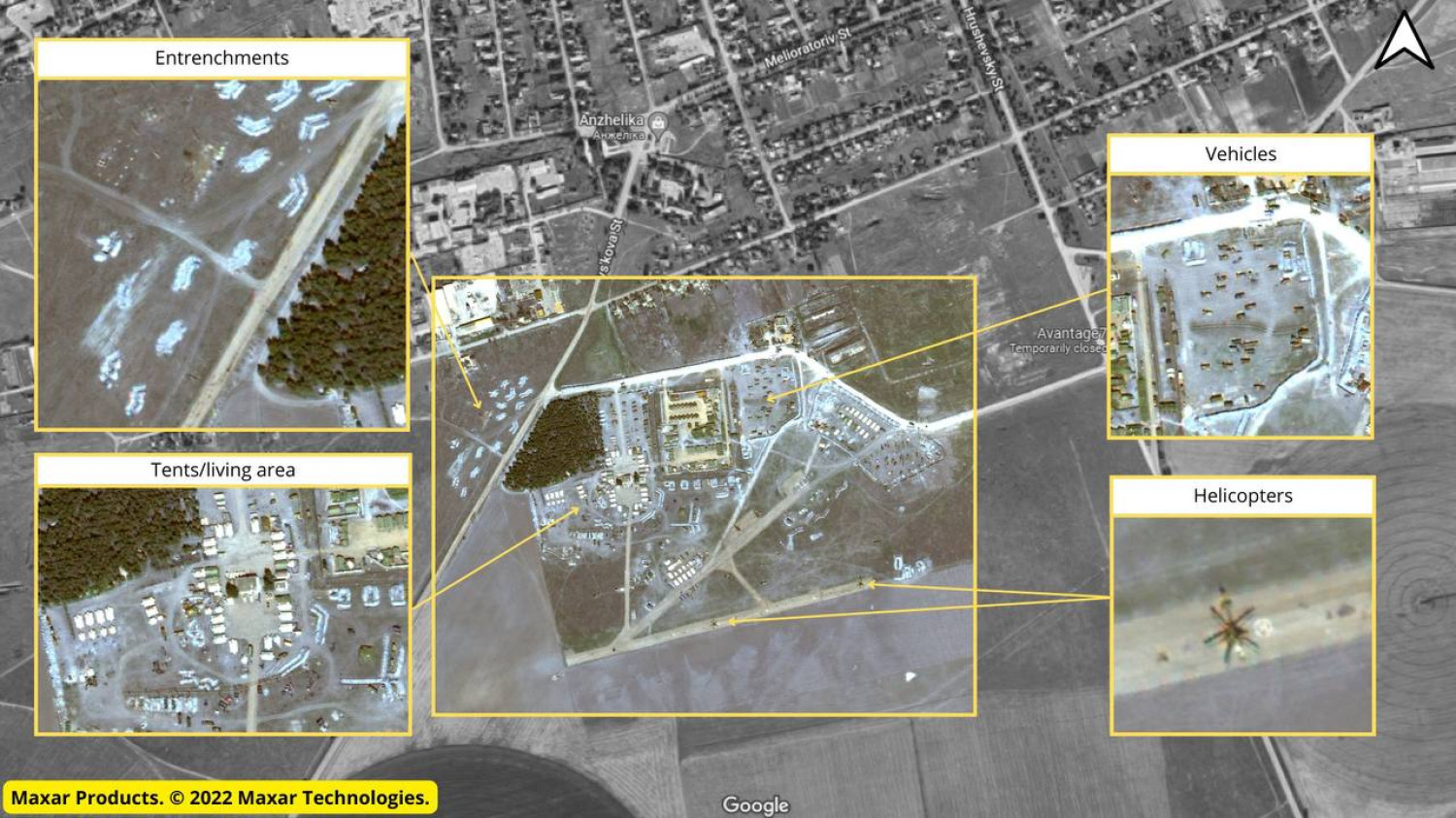Об этом свидетельствуют спутниковые снимки, обнародованные компанией Maxar. На них видно, как на небольшом аэродроме на окраине этого поселка появились грузовики, палатки и инженерные сооружения — траншеи с огневыми точками. На взлетной полосе стоит несколько вертолетов.