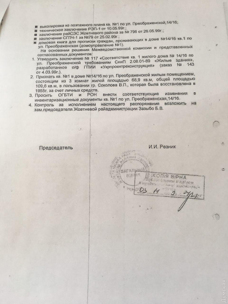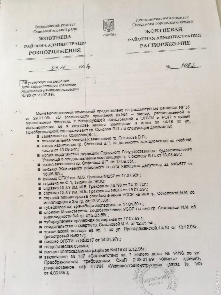 Конфликт в Грековке: мастерскую училища приватизировали наследники бывшего директора (документ)«Думская» выяснила подоплеку сегодняшних событий в Одесском художественном училище имени Грекова. Оказывается, помещение на Преображенской, 14/16, которое пытался захватить предприниматель Сергей Барановский, таки числится жилым. Об этом «Думской» рассказал сотрудник муниципалитета, пожелавший остаться неназванным. Три комнаты в одноэтажном домике, которые давно уже занимает мастерская-студия дизайнеров, фигурируют в документах как квартира №1. В далеком 1954 году в них поселили тогдашнего замдиректора училища по учебной части Василия Соколова, который впоследствии возглавил учебное заведение. Он некоторое время жил в доме, отремонтировал его за свой счет, а в 1990-х обратился в Жовтневую райадминистрацию Одессы с заявлением о признании помещения жилым. Ходатайство было удовлетворено. После смерти руководителя его семье, которая уже не проживала в «квартире», удалось добиться ее приватизации, а в феврале этого года дочь Соколова продала дом Барановскому. В реестре прав на недвижимость, правда, никаких записей об этом не появилось, поэтому вопрос, чье здание, остается спорным. По всей видимости, ответ на него теперь может дать только суд. СМЕРТЬ РОСІЙСЬКИМ ОКУПАНТАМ! Помітили помилку? Виділяйте слова з помилкою та натискайте control-enter |