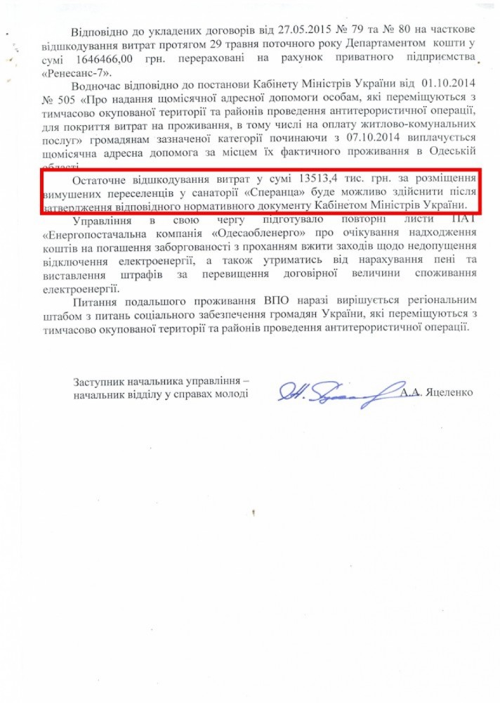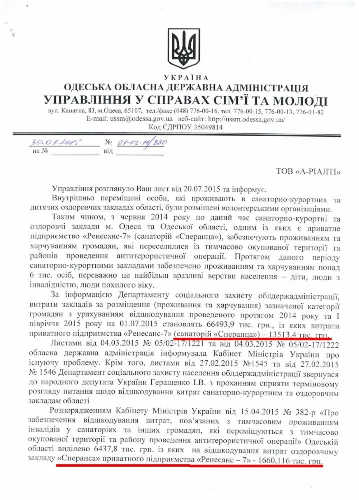«Думская» неоднократно писала о ситуации в санатории «Сперанца», где в прошлом году поселили группу инвалидов-беженцев, которые были вынуждены выехать из зоны АТО. Со временем их положение изменилось не в лучшую сторону. Санаторий предназначен для летнего отдыха, однако после окончания сезона арендатор, предприятие «Ренессанс-7», решил заработать в зимний период и по договоренности с ОГА разместил в нем беженцев. Серьезные проблемы начались с первыми холодами: в здании нет системы отопления, и люди использовали электрические обогреватели, подаренные волонтерами. 1 января 2015 года срок аренды санатория закончился, однако «Ренессанс-7» не выплатил арендную плату, не рассчитался за электричество и другие коммунальные платежи. Люди продолжают жить в неприспособленных помещениях, и на сегодняшний день общая сумма долгов достигла 2,5 миллиона. Только 27 мая 2015 года (через полгода после окончания договора аренды и за день до смены руководства областной администрации) предприятие «Ренессанс-7» подписало договор с ОГА и получило 1,6 миллиона гривен бюджетных средств за оказанные услуги по размещению беженцев. При этом представители ОГА даже не поинтересовались, есть ли действующий договор аренды, не запросили правоустанавливающие документы. По сути, они поверили на слово предпринимателю, который представлялся «администрацией санатория». Получив бюджетные деньги, арендатор не торопился погашать долги, которые продолжали накапливаться. Поэтому ООО «Одессоблэнерго» обратилось в суд и потребовало от владельца (не от арендатора) возместить задолженность — 1,8 миллиона гривен. В областной администрации владельцу санатория, фирме «А-Риалти», посоветовали обратиться в суд. 3 июня 2015 года решением Хозяйственного суда Одесской области счета «Ренессанс-7» были арестованы. Однако 24 июня 2015 года судья Светлана Железная, которую на один день отозвали из отпуска, сняла арест. Бюджетные средства со счета были сняты, но за электроэнергию не было заплачено ни копейки. 4 августа судья Железная вынесла решение и обязала «Ренессанс-7» выплатить задолженность по арендной плате — но только 110 тысяч гривен из почти 2 млн грн. Вопрос с погашением долгов за электроэнергию повис в воздухе, в этой части истцу было отказано. Чем руководствовался суд, станет известно 7 августа, когда будет подготовлен и подписан полный текст судебного решения. Фактически, разместив на чужих площадях переселенцев и накопив долги по санаторию, Валерий Супруненко (директор ЧП «Ренессанс -7») заработал порядка 1,5 млн грн. Тем временем продолжаются судебные разбирательства по иску «Одессаоблэнерго». Энергетики уже несколько раз отключали санаторий за неуплату, но после звонков из ОГА снова включали электричество. Однако ситуация на энергорынке такова, что «злостный неплательщик», коим сейчас юридически является владелец санатория, может быть отключен в любой момент. По словам коммерческого директора «А-Риалти» Ольги Лябах, предприятие не имеет возможности оплатить такую большую задолженность. Поэтому, если суд удовлетворит требование энергетиков, то санаторий, в котором до сих пор живут инвалиды, будет продан с молотка. Областная администрация, с согласия которой в прошлом году беженцы были размещены в неприспособленном помещении, признает, что перед санаториями накопил