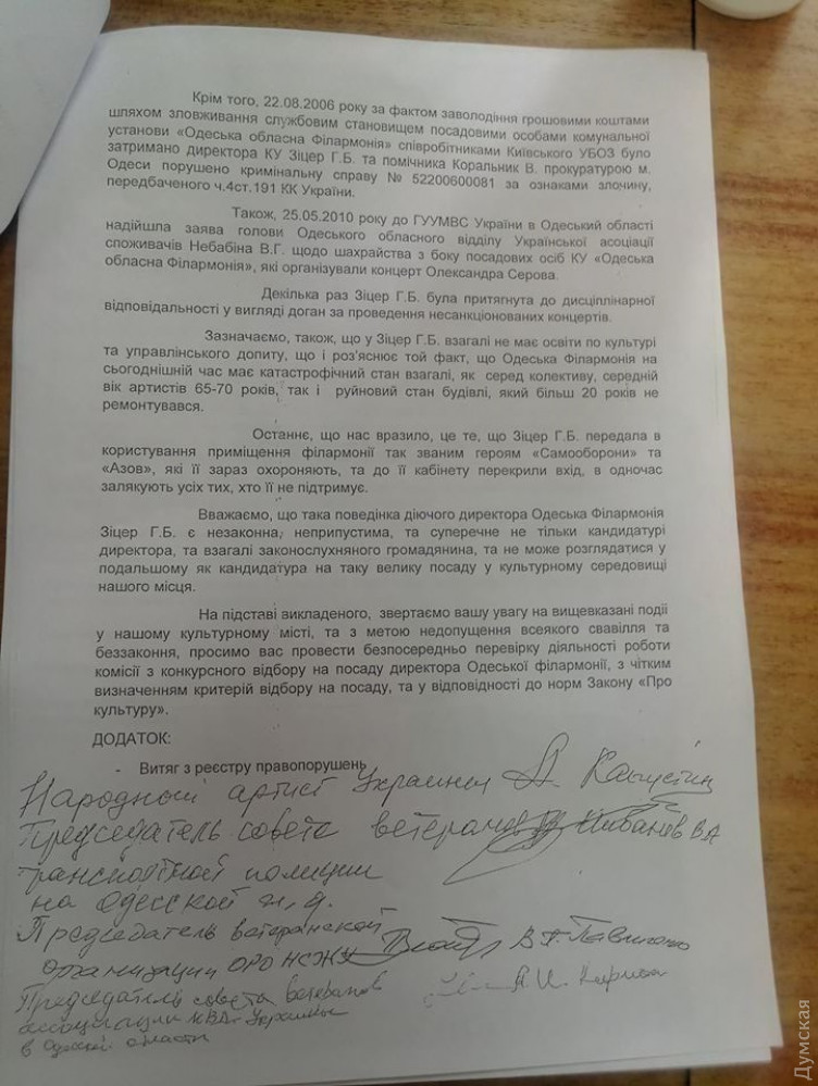 Действующий директор Одесской государственной филармонии Галина Зицер выиграла конкурс на должность руководителя учреждения. Такое решение конкурсная комиссия под председательством известного журналиста Вячеслава Воронкова приняла сегодня, передает корреспондент «Думской». За Зицер проголосовали семь членов комиссии, двое воздержались. Второго кандидата — солистку Оперного театра Веру Ревенко — не поддержал никто. Вердикту комиссии предшествовало бурное обсуждение. На заседание пришли депутаты от «Батькивщины», которые заявили, что Зицер надо снимать с конкурса, потому что в отношении нее 1 марта было открыто уголовное производство по ст. 366-1 УК Украины (декларирование недостоверной информации). Также в вину Зицер поставили то, что она «передала в пользование помещения филармонии так называемым героям «Самообороны» и «Азова». Об этом идет речь в обращении, подписанном председателями ветеранских организаций транспортной полиции и Национального союза журналистов. Комиссия, однако, к аргументам противников директора не прислушалась. Теперь Галину Зицер должен утвердить на должности областной совет. Напомним, он далеко не всегда выполняет требования Закона Украины «О культуре», который обязывает подписывать контракты с победителями конкурсов. СМЕРТЬ РОСІЙСЬКИМ ОКУПАНТАМ! Помітили помилку? Виділяйте слова з помилкою та натискайте control-enter |