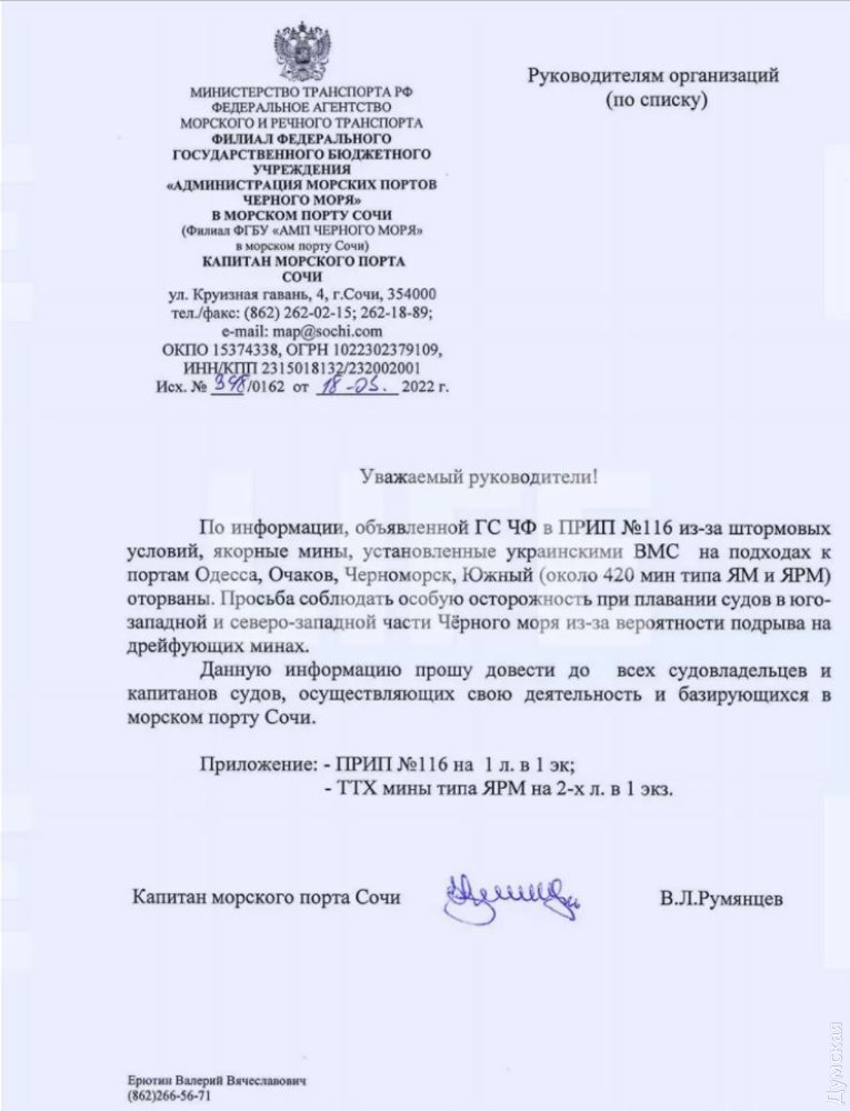 По его словам, опасную дезинформацию распространяет капитан морского порта Сочи. Он заявил, что украинские Военно-морские силы якобы выставили якорные мины на подходе к Одессе, Черноморску, Южному и Очакову, которые сорвало штормом и отнесло южнее — к проливу Босфор.