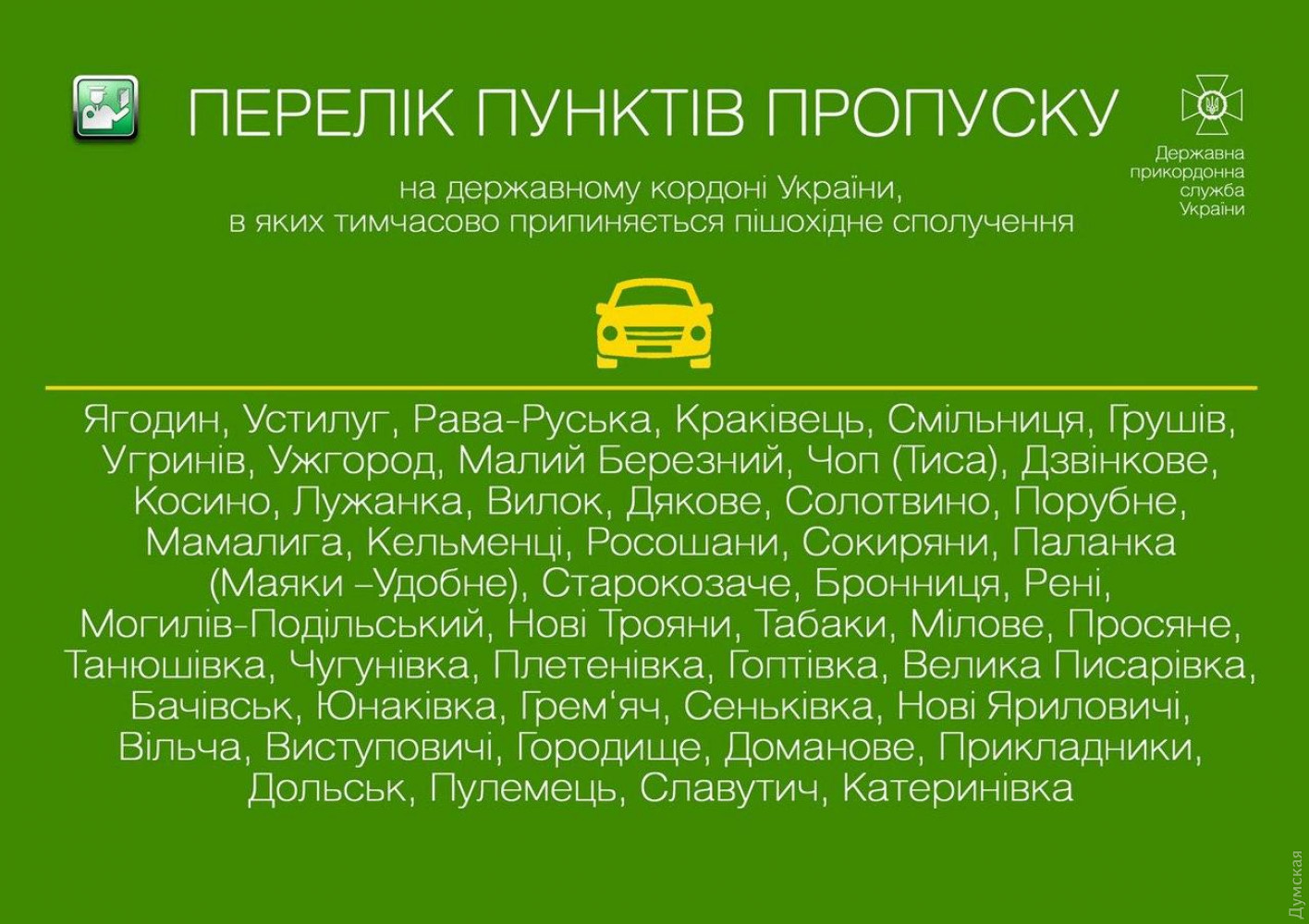Большая часть пунктов пропуска через государственную границу Украины будет полностью закрыта, а оставшиеся закроют для пешеходов и международных пассажирских перевозок (самолет, поезд, пароход, автобус). Через некоторые КПП можно будет проехать на личном автотранспорте, сообщает правительство. Кроме того, с понедельника, 16 марта, на две недели запрещен въезд иностранцам и лицам без гражданства, кроме дипломатов и тех, у кого есть вид на жительство в Украине. В Одесской области полностью закроют 28 из 33 пунктов пропуска. На личном и грузовом транспорте можно будет выехать за границу или вернуться в Украину через Паланку, Староказачье, Рени, Новые Трояны и Табаки. Пограничники намерены усилить смены нарядов в этих КПП и перераспределят на них наличные ресурсы, технические средства и средства защиты. Одновременно будет усилена охрана пунктов пропуска, где прекращается движение. Все граждане, которые въезжают в Украину, будут подвергаться обязательному температурному скринингу. Гражданам Украины, которые сейчас находятся за рубежом и попали в чрезвычайную ситуацию, рекомендуют обращаться в ближайшее дипломатическое учреждение нашей страны — консульство, почетное консульство или посольство. Кроме того, у МИДа есть круглосуточная горячая линия +38 (044) 238-16-57 и электронная почта cons_or@mfa.gov.ua. СМЕРТЬ РОСІЙСЬКИМ ОКУПАНТАМ! Помітили помилку? Виділяйте слова з помилкою та натискайте control-enter Новини по цій темі: 4 березня 2023: "Вакцини-довгожителі", або Як щеплення проти COVID-19 перетворилися в Україні на небезпечний ритуал 27 січня 2023: МОЗ зобов`язали опублікувати договори на закупівлю вакцин проти COVID-19: апеляційний суд задовольнив позов журналіста "Думської" 11 січня 2023: За тиждень в Одесі зафіксовано 159 випадків ковіду 4 січня 2023: За тиждень в Одесі зареєстровано 113 випадків ковіду |