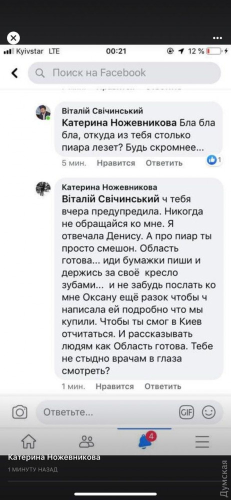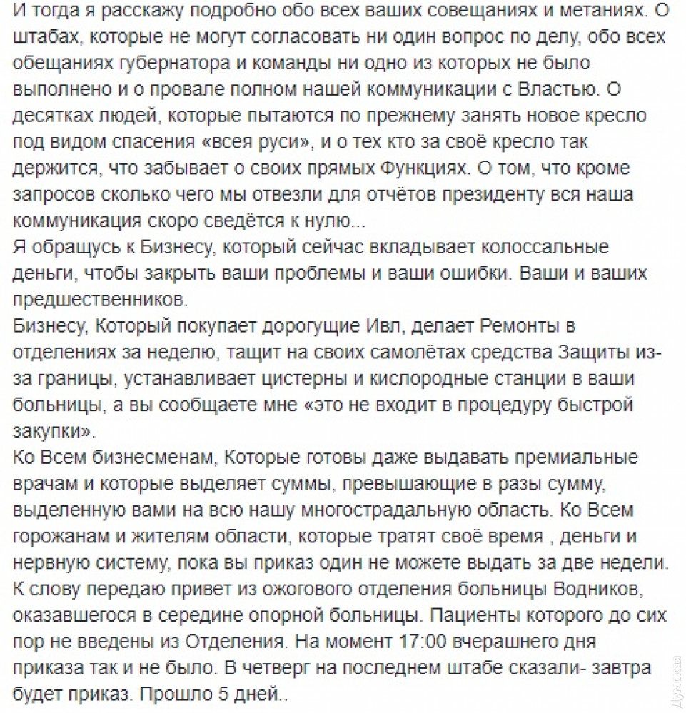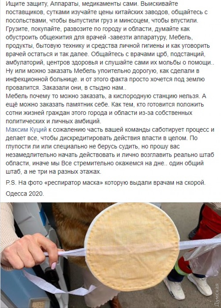 дорогую мебель. «Мебель почему-то можно заказать, а кислородную станцию нельзя. А еще можно заказать памятник себе. Как тем, кто готовится положить сотни жизней граждан этого города и области из-за собственных политических и личных амбиций», — заявила она. Координатор антикризисного штаба подчеркнула: все, что сейчас делается, чтобы остановить распространение эпидемии, делают медики, волонтеры и бизнесмены, а чиновники только мешают процессу. «Максим Куцый, к сожалению, часть вашей команды саботирует процесс и делает все, чтобы дискредитировать действия власти в целом. По глупости ли или специально, не берусь судить, но прошу вас незамедлительно начать действовать и лично возглавить реально штаб области, иначе мы все стремительно окажемся на дне. Один общий штаб, а не три на разных этажах», — обратилась к председателю Одесской облгосадминистрации координатор антикризисного штаба. В ответ на гневный текст Катерины Ножевниковой вице-губернатор Виталий Свичинский обвинил ее в самопиаре. «Бла, бла, бла, откуда из тебя столько пиара лезет? Будь скромнее