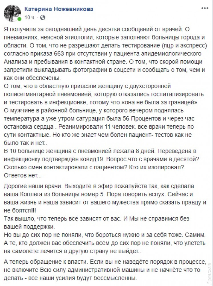 Руководитель благотворительного фонда «Корпорация монстров» и координатор антикризисного штаба по борьбе с коронавирусом в Одесской области Катерина Ножевникова призвала медиков не молчать, «выходить в эфир» и сообщать о подозрениях на COVID-19 и об отношении властей к заболевшим и врачам. Об этом Ножевникова написала на своей страничке в «Фейсбуке».
