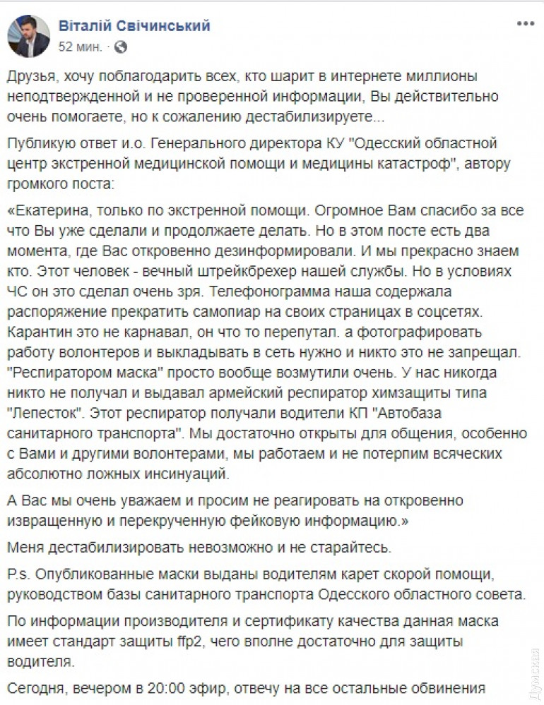 То, что больницы ничем не обеспечены, — это правда. В районной больнице под Одессой всего 30 тестов. Использовать их можно будет только в крайних случаях. Защитных костюмов несколько, и то, не у скорой помощи. И всего 1 аппарат ИВЛ! Карантин нужен, но карантинные мероприятия нужно было начинать совершать именно с теми, кто вернулся с других стран!!! Сейчас это просто бесполезно!!!