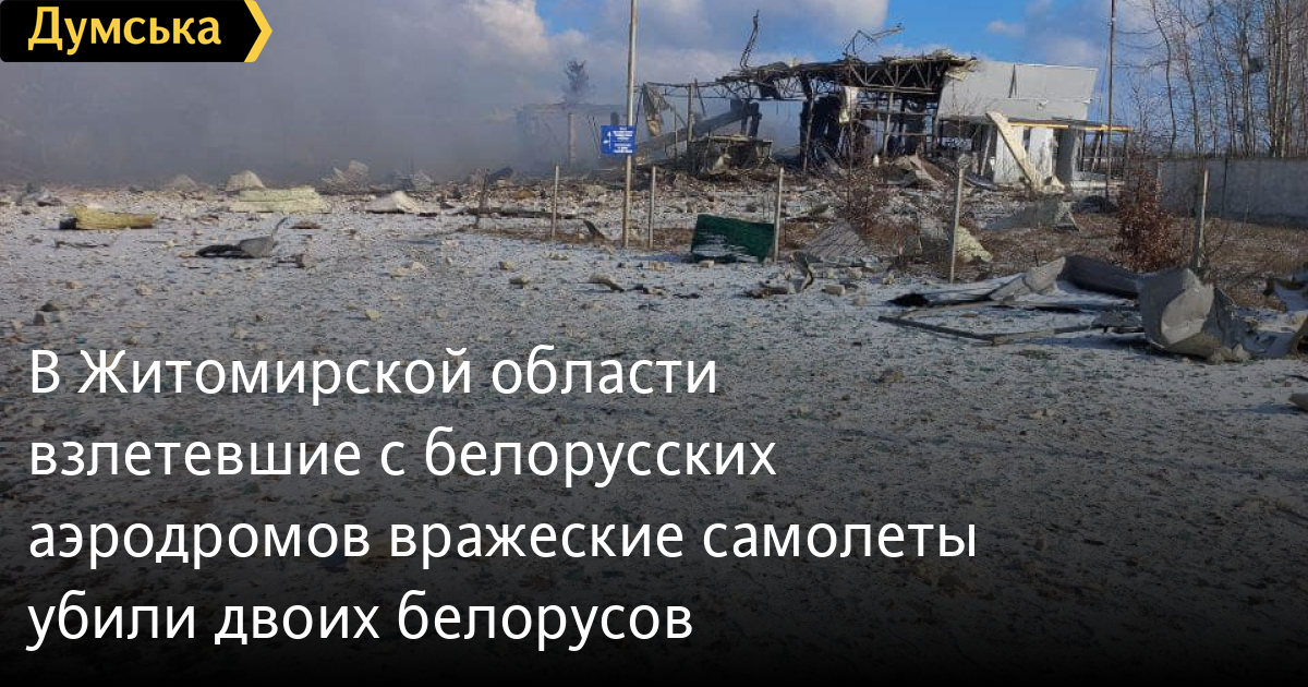 В Житомирской области взлетевшие с белорусских аэродромов вражеские самолеты убили двоих белорусовРоссийские самолеты, взлетевшие с белорусских аэродромов, обстреляли город Коростень Житомирской области. В результате авиаудара погибли три человека, двое из которых — граждане Беларуси. «Погиб один мирный житель — наш соотечественник. Еще два человека — белорусы — получили ожоги, несовместимые с жизнью. Они остановились на машинах и не знали, что как раз с белорусских аэродромов вылетят российские самолеты и будут бомбить Коростень», — отметил мэр города Владимир Москаленко. СМЕРТЬ РОСІЙСЬКИМ ОКУПАНТАМ! Помітили помилку? Виділяйте слова з помилкою та натискайте control-enter |