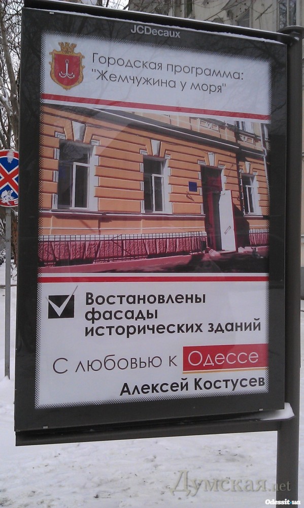 Восстановленный Азаровым на должность мэра, Костусев своим «фасадом» украсил рекламные щиты, где повествует как руками Тарпана, Климова и прочих лепит из Одессы конфетку под эгидой «покращення» и на зависть «попередныкам».