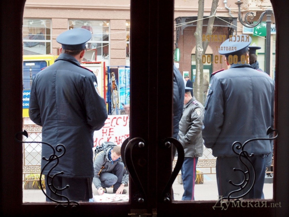 «Нам дали поручение никого не выпускать из помещения, пока не закончится отчет, — рассказал «Думской» один из охранников мероприятия, — Организаторы мероприятия боятся, что если двери откроются и начнут выходить люди, сюда прорвутся митингующие одесситы».