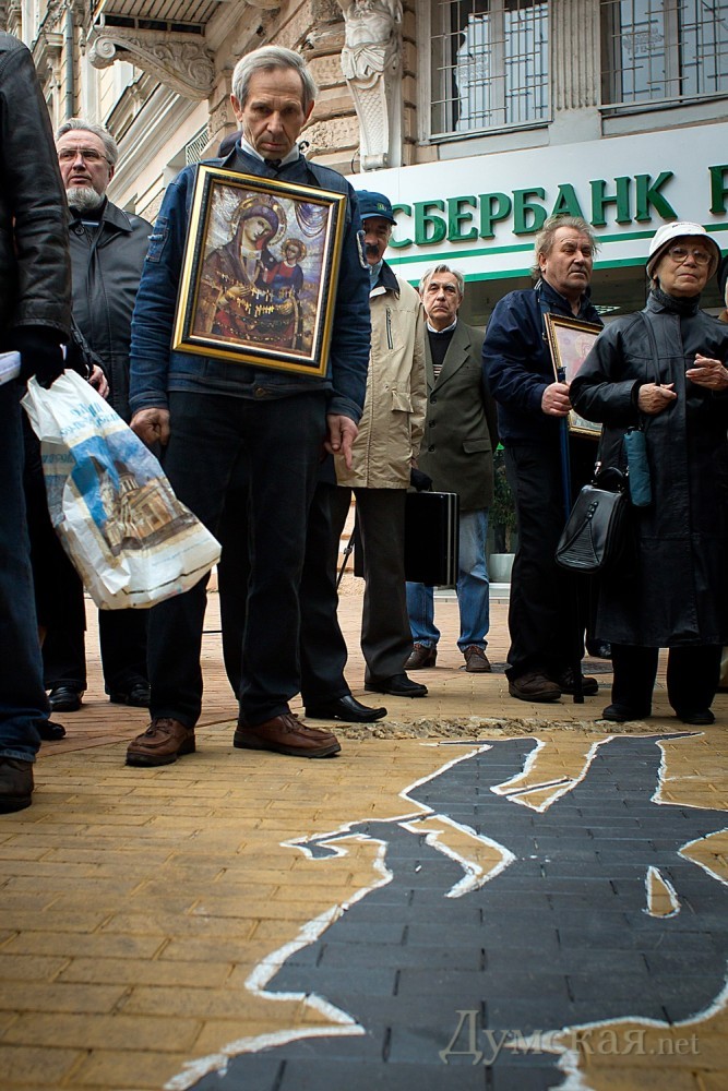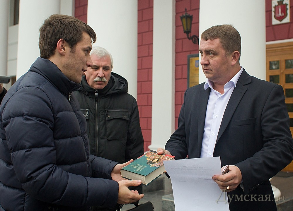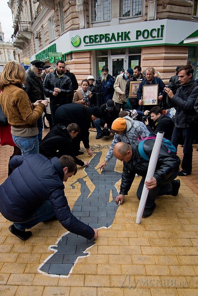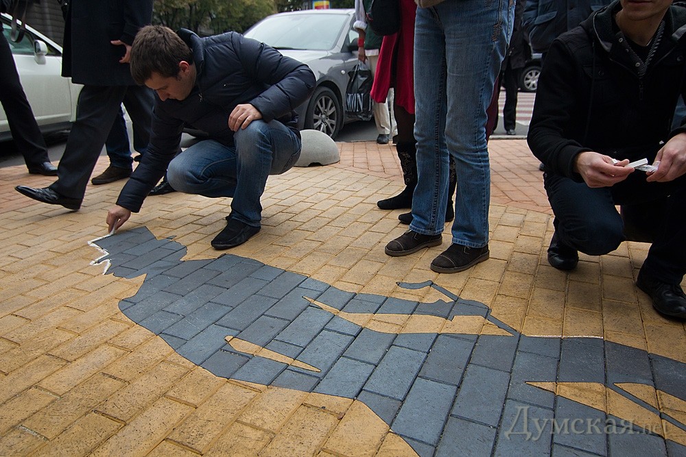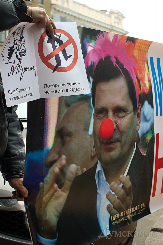Противники памятного знака «Тень Пушкина» провели сегодня очередную акцию по борьбе с тенью. Чтобы обратить внимание городского головы на не единожды озвученное требование уничтожить памятный знак, недавно открытый на пересечении улиц Ришельевской и Дерибасовской, активисты «Молодежного Единства» передали Алексею Костусеву томик произведений Александра Сергеевича. По словам общественников, прочтение фразы Евгения Онегина «Чином от ума избавлен…» должно подтолкнуть мэра города к принятию решения. «Если же Алексей Косусев опять проигнорирует наше требование, мы обратимся за помощью к почетным одесситам и соберем пять тысяч подписей для вынесения соответствующего решения на сессию Одесского городского совета», — сказал общественный деятель Антон Давидченко. К сожалению, передать лично в руки мэру свой презент общественники не смогли, ввиду отсутствия его на рабочем месте, поэтому довольствовались обещанием охранников горсовета передать «посылочку». Затем участники акции обвели памятный знак белым мелом. «Этим мы хотим показать, что подобными знаками городская власть убивает великого русского поэта и память о нем» — заявил Давидченко. Читайте также: Тень Пушкина: мини-драма в двух действиях Фото: Александр Гиманов СМЕРТЬ РОСІЙСЬКИМ ОКУПАНТАМ! Помітили помилку? Виділяйте слова з помилкою та натискайте control-enter