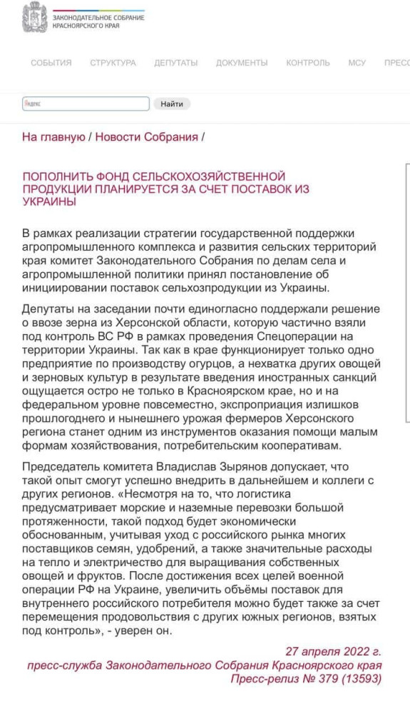 Депутаты Красноярского края рф практически единогласно поддержали решение о воровстве зерна из Херсонской области, часть которой оккупировали российские нацисты. Об этом говорится на сайте законодательного собрания Красноярского края россии. Незаконные поставки сельхоз продукции из оккупированных территорий Украины российские депутаты объяснили «нехваткой овощей и зерновых культур в результате введения иностранных санкций». В оккупированной части Херсонской области россияне увидели «излишки прошлогоднего и нынешнего урожая». Украинские продовольственные запасы планируют попросту воровать, чтобы кормить жителей россии. Кроме того, в сообщении призывают депутатов из других регионов внедрить подобный опыт. «Увеличить объемы поставок для внутреннего российского потребителя можно будет также за счет перемещения продовольствия с других южных регионов, взятых под контроль», — пишут на сайте законодательного собрания. СМЕРТЬ РОСІЙСЬКИМ ОКУПАНТАМ! Помітили помилку? Виділяйте слова з помилкою та натискайте control-enter |
